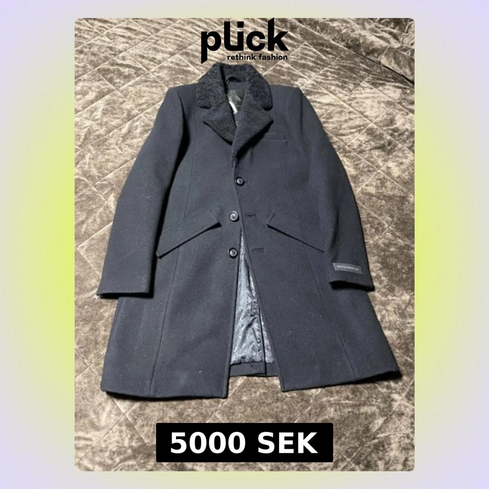 Snygg svart rock från Moose Knuckles med bred krage i teddy och tre knappar framtill. Jackan har raka linjer, diskreta fickor och dragkedjor vid ärmsluten. Fodret har ett subtilt mönster och materialet är ullblandning för extra värme.