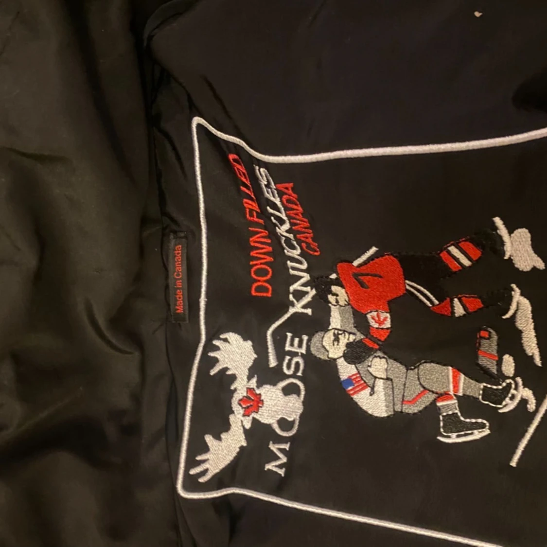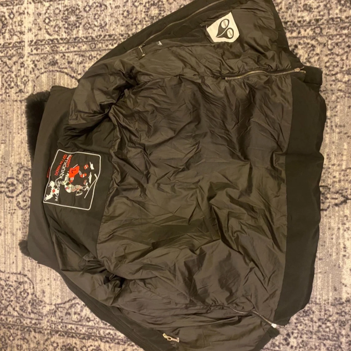 Svart dunjacka från Moose Knuckles med fet pälskant på huvan och broderad patch på insidan. Jackan har dragkedja, långa ärmar och coola metalldetaljer på ärmen. Perfekt för kalla dagar när du vill hålla stilen.