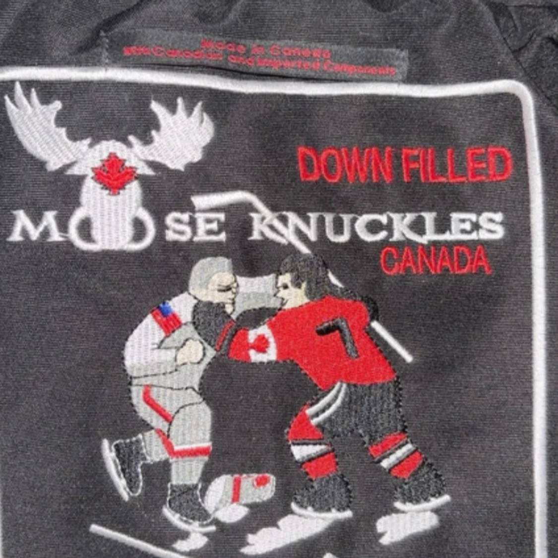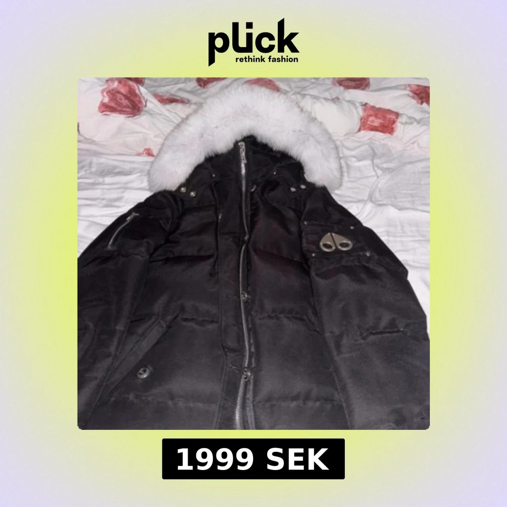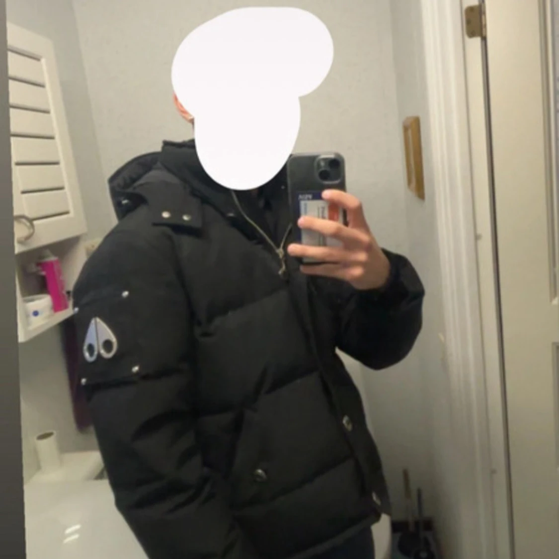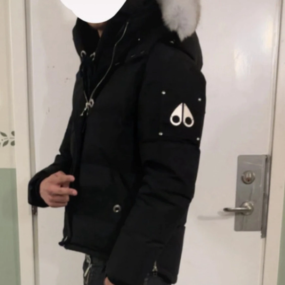 Säljer en svart dunjacka från Moose Knuckles med vit päls på huvan och ikonisk logga på ärmen. Jackan har dragkedja framtill, flera fickor med knappar och detaljer i metall. Perfekt för kalla dagar och har en riktigt snygg streetstil.