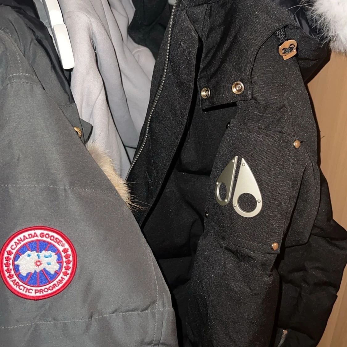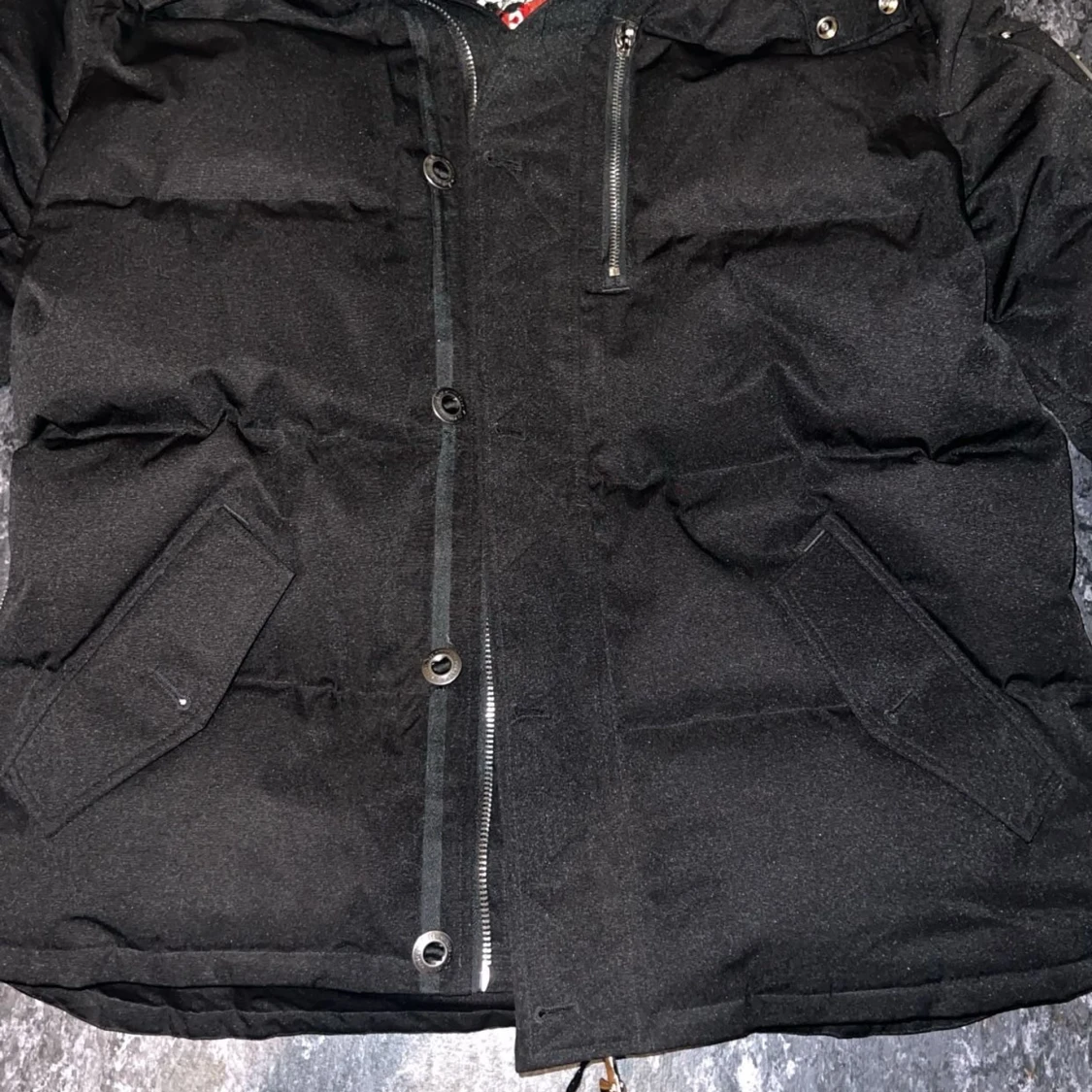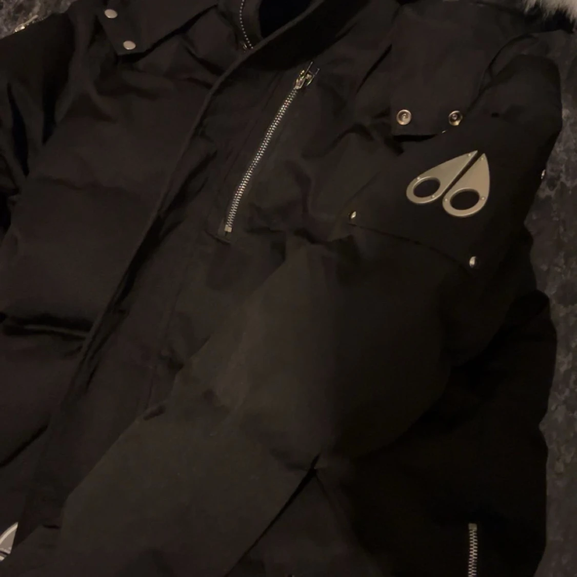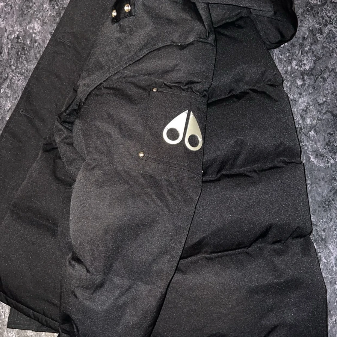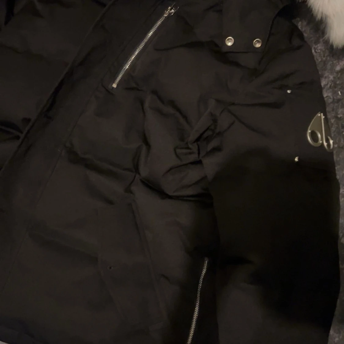 Svart dunjacka från Moose Knuckles med ikonisk metall-logga på ärmen, huva med pälsdetalj och flera fickor med dragkedja och knappar. Jackan har en puffad look och är perfekt för kalla dagar. Snygg och stilren design med detaljer i silver.