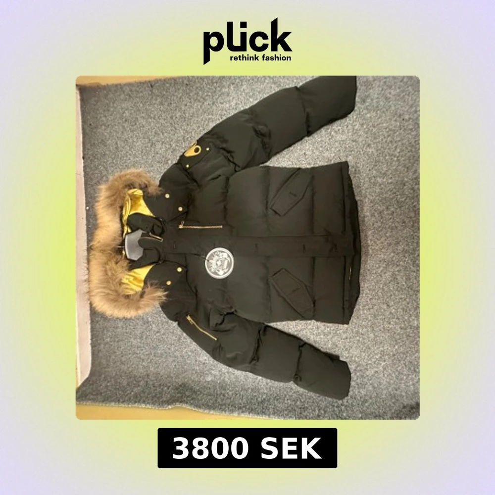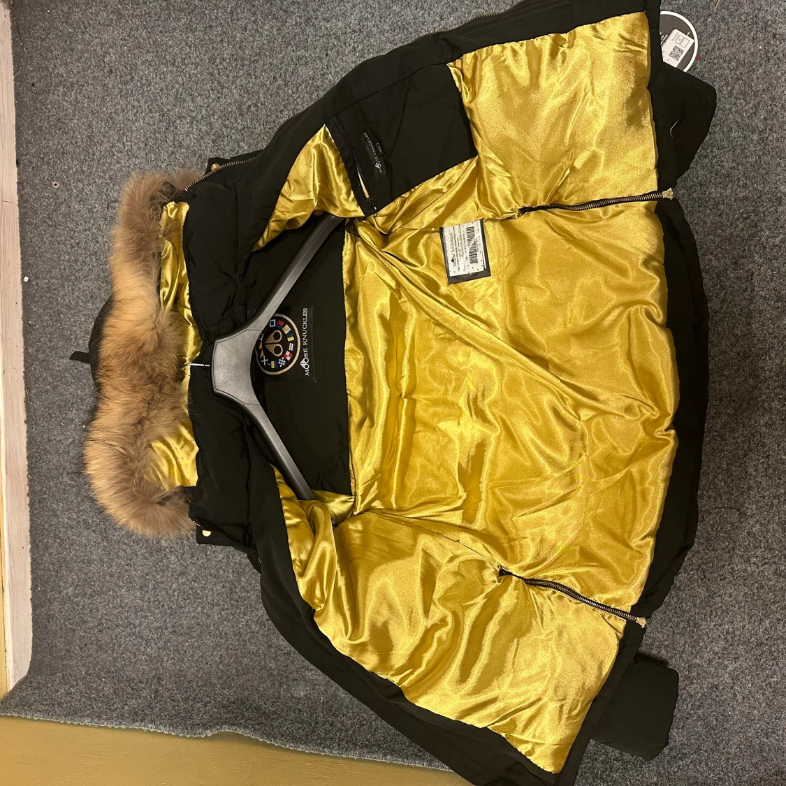 Säljer en svart dunjacka från Moose Knuckles med guldfärgat innerfoder och pälskantad huva. Jackan har flera fickor, guldiga dragkedjor och snygga detaljer på ärmen. Perfekt för kalla dagar när du vill hålla stilen.