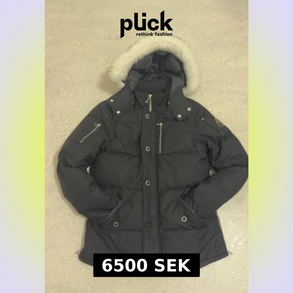 Svart pufferjacka från Moose Knuckles med fluffig vit fuskpäls runt luvan. Jackan har flera dragkedjor, knappar och praktiska fickor framtill. Luvan är stor och jackan har en snygg, quiltad look som håller dig varm hela vintern.