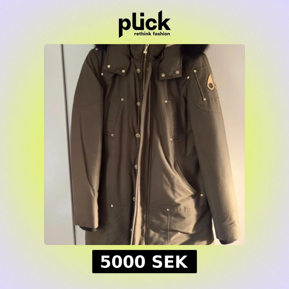 Olivgrön parkajacka från Moose Knuckles med svart pälskantad huva, guldiga detaljer och broderad hockeymotiv på insidan. Jackan har flera fickor, dragkedja och knappar framtill samt ikonisk logga på ärmen. Perfekt för kalla dagar.