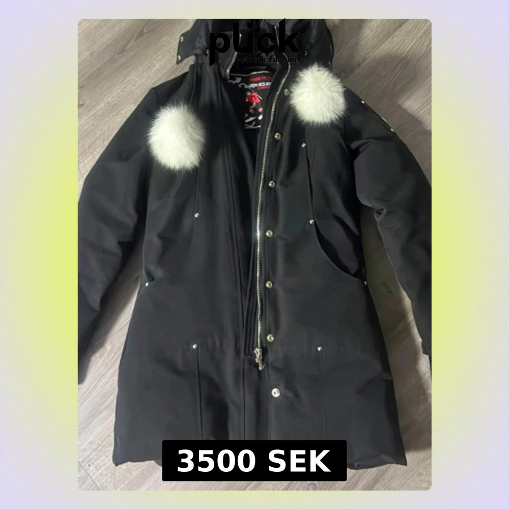 Svart dunjacka från Moose Knuckles med fluffiga vita pälsdetaljer på huvan och axlarna. Jackan har dragkedja, knappar och ett metallmärke på ärmen. Insidan är quiltad och fodrad för extra värme. Perfekt för kalla dagar och har en snygg, lång siluett. Kan tänkas sänkas vid snabb affär.