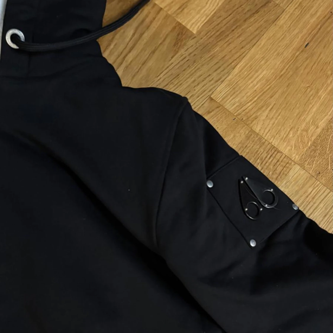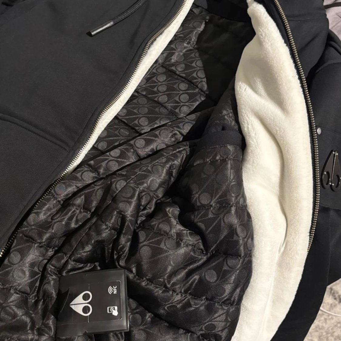 Svart teddyjacka från Moose Knuckles med vit fluffig fuskpäls på insidan av huvan. Jackan har dragkedja, snörning i huvan och ett snyggt logomärke på ärmen. Insidan är quiltad med mönstrat foder. Perfekt för kalla dagar.