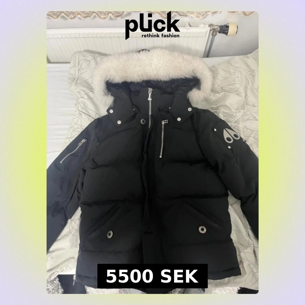Säljer en svart dunjacka från Moose Knuckles med fluffig vit päls på huvan. Jackan har silvriga dragkedjor, logga på ärmen och flera fickor med tryckknappar. Perfekt för kalla dagar och har en riktigt snygg streetstil. (Kvitto medföljer)