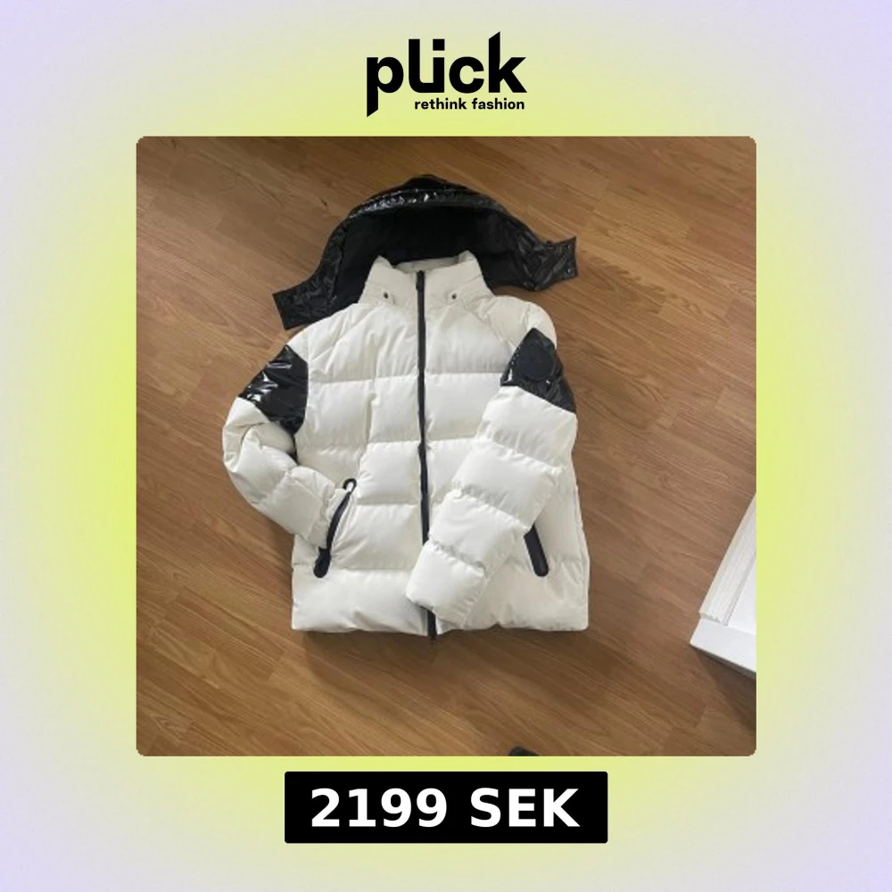 Säljer en fet pufferjacka från Moose Knuckles i vit med svarta detaljer och glansiga partier på ärmar, rygg och huva. Jackan har dragkedja, hög krage och stor logga på ärmen. Perfekt för kalla dagar när du vill sticka ut.