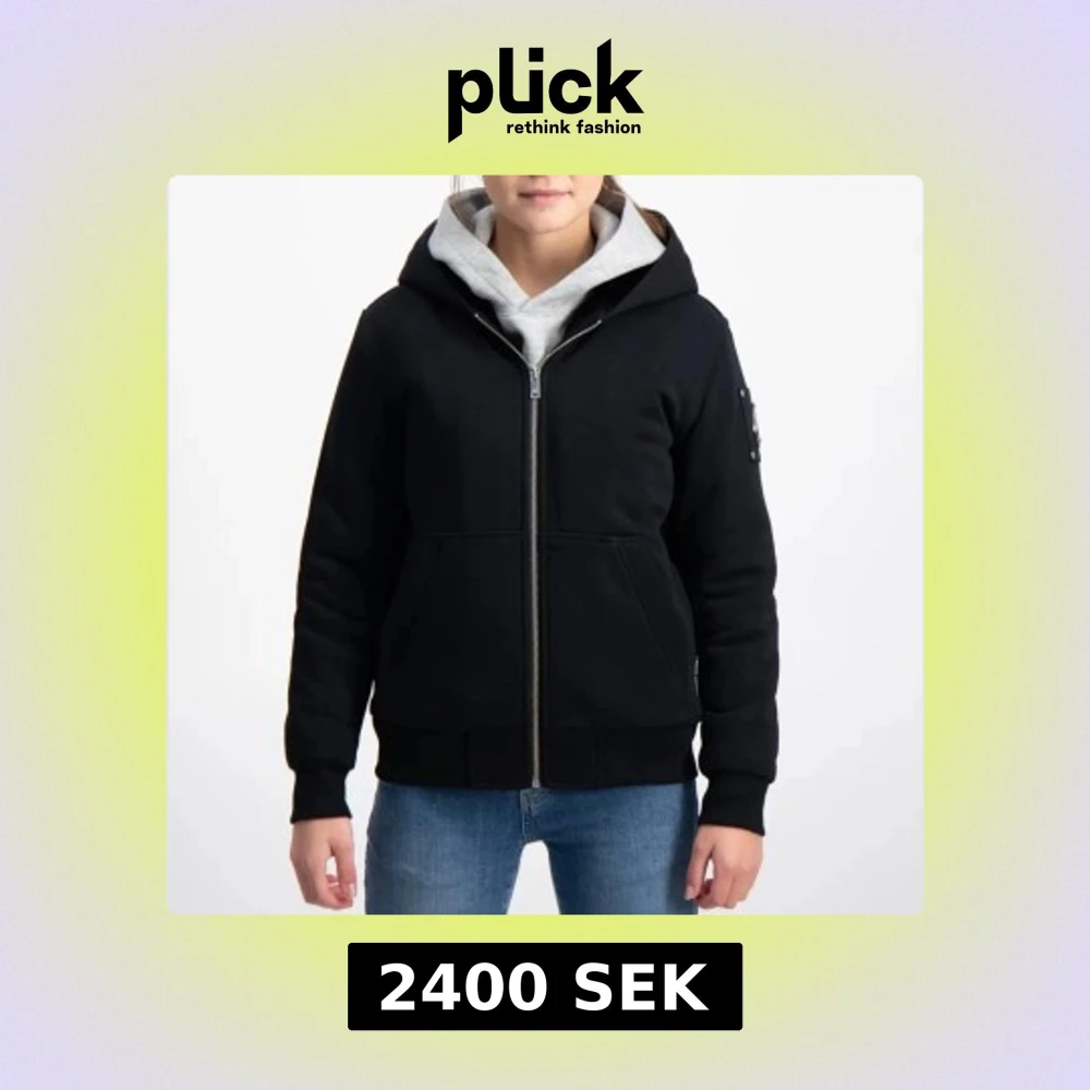 Svart bomberjacka med huva från Moose Knuckles, har en snygg metall-logga på ärmen och praktiska fickor framtill. Jackan är tillverkad i mjuk bomull och polyester, med dragkedja och ribbade muddar. Perfekt för dig som gillar streetstyle och vill ha en clean look. Den är i str ” L ” barn storlek och passar de som är 157 - 165 cm