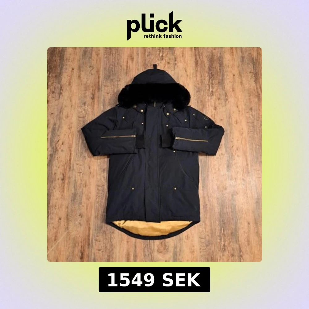 Svart parkas från Moose Knuckles med guldfärgade detaljer och emblem på ärmen. Jackan har huva med svart päls, guldfärgat innerfoder och dragkedjor på ärmarna. Fylld med dun för extra värme och har långa ärmar samt flera fickor framtill.