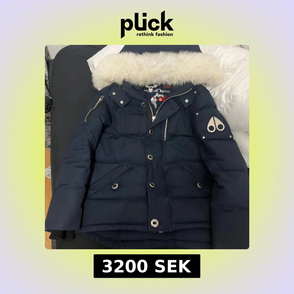 Snygg mörkblå dunjacka från Moose Knuckles med fluffig vit päls på huvan, silverfärgade detaljer och broderad patch på insidan. Jackan har långa ärmar, dragkedja, knappar och flera fickor. Perfekt för kalla dagar och har en cool logga på ärmen.