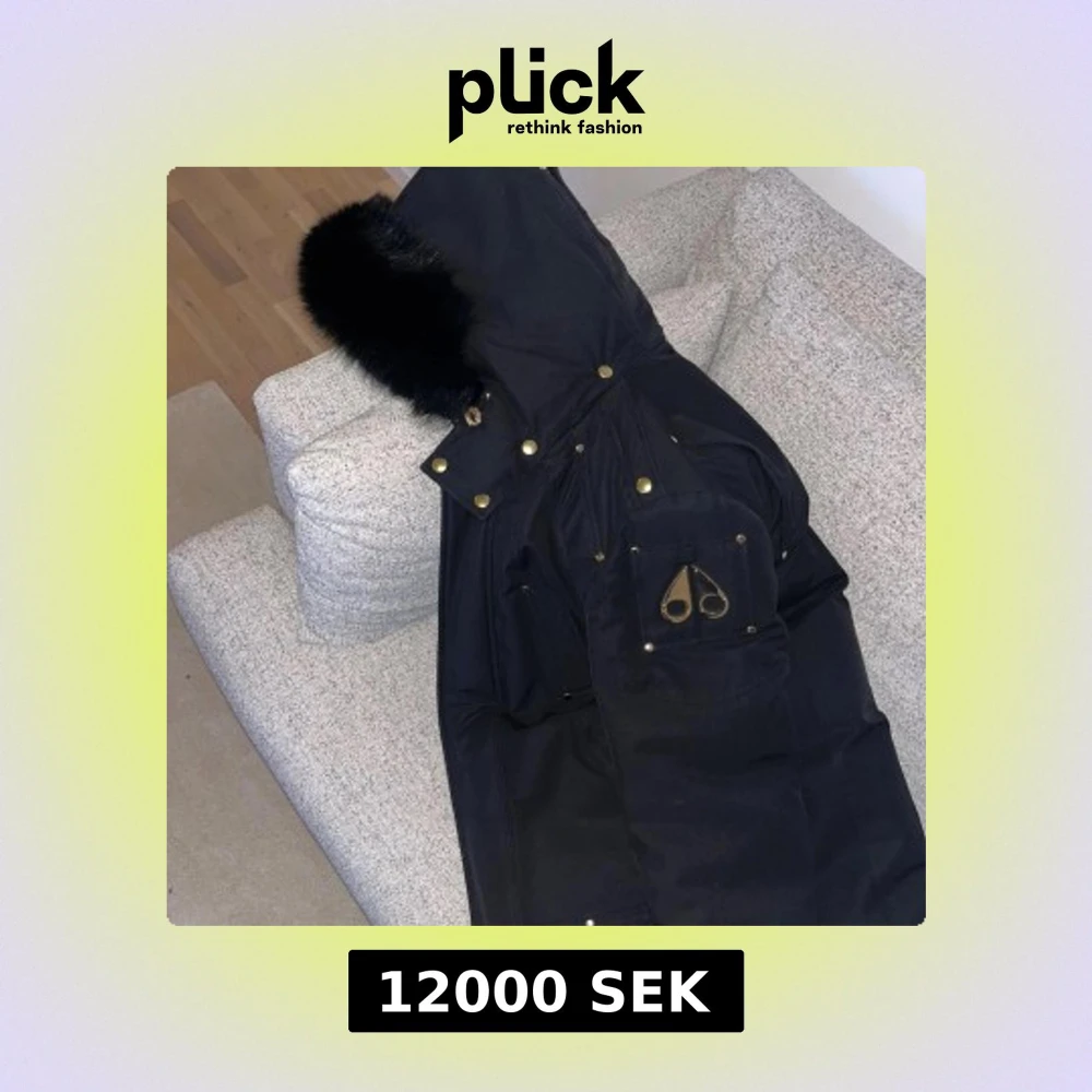 Säljer en svart dunjacka från Moose Knuckles med lyxig svart äkta päls på huvan och guldfärgade detaljer. Helt äkta ny pris går för 17000kr. Insidan är quiltad i guld med logomönster och broderad rygg. Jackan har dragkedja, knappar och flera fickor med ikonisk logga.