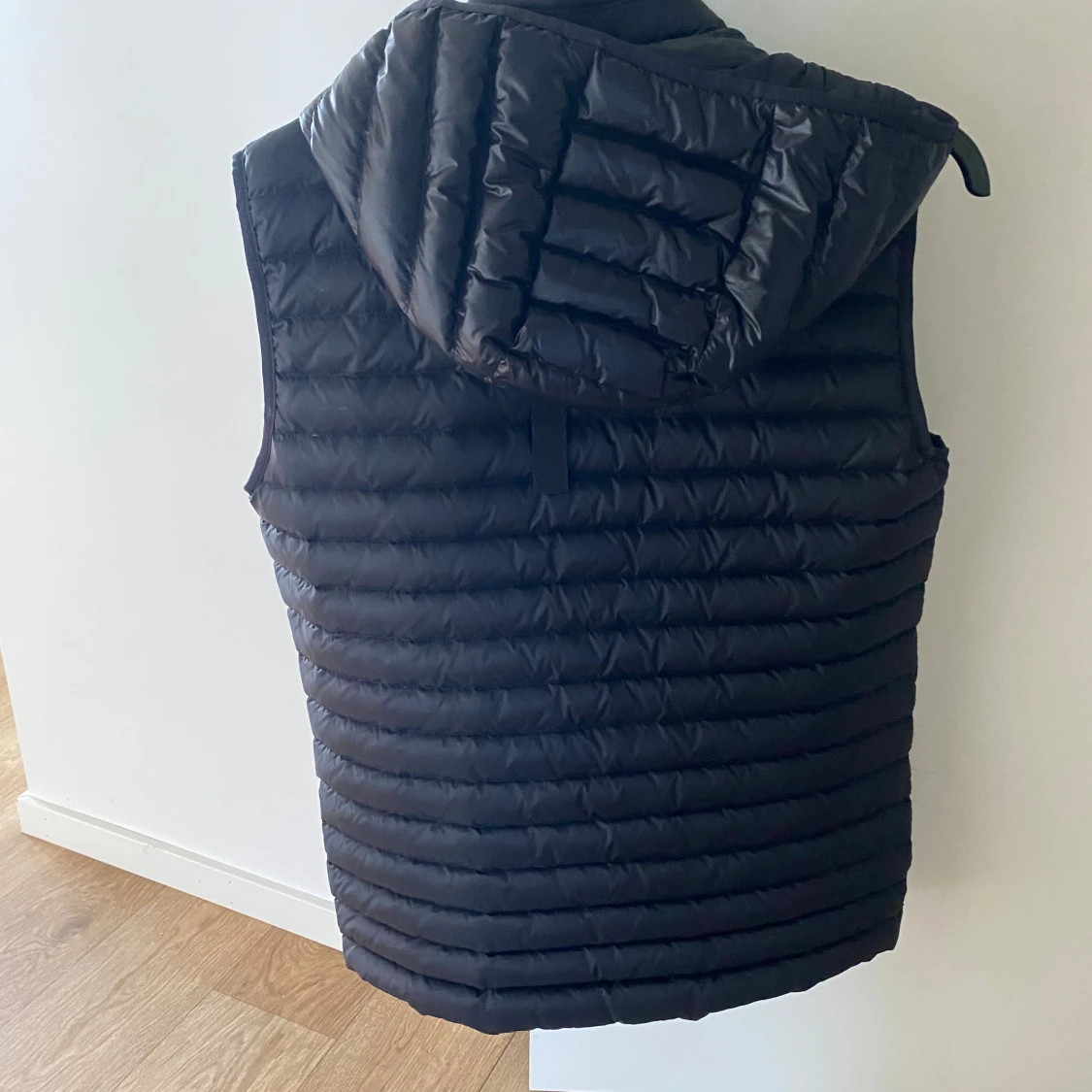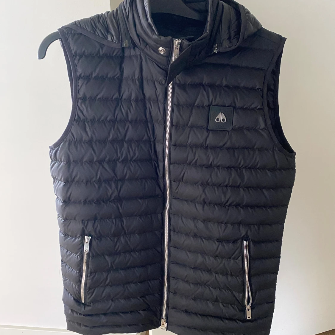Svart dunväst från Moose Knuckles med quiltad design och avtagbar huva. Västen har två fickor med dragkedja och en diskret logga på bröstet. Perfekt för lager-på-lager och snygg till streetwear. Lätt och smidig att bära.