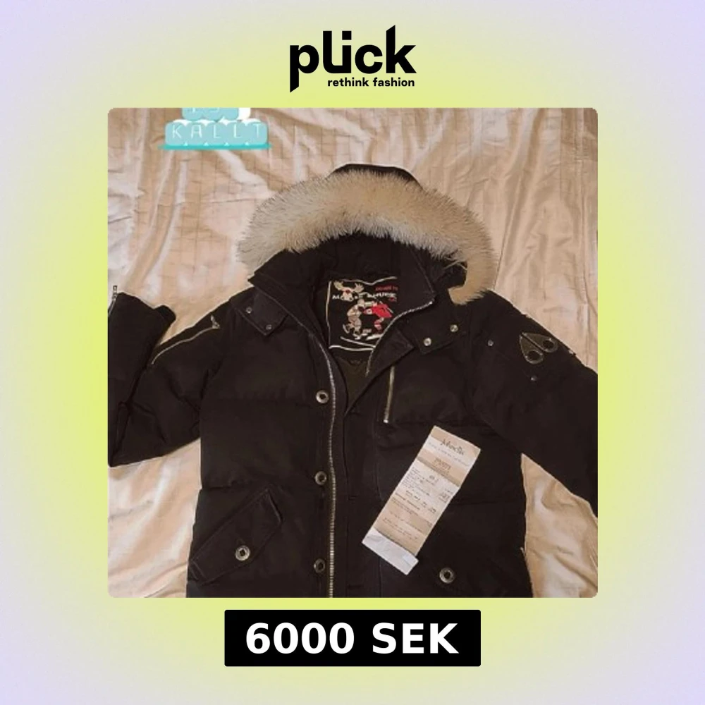 Säljer en svart dunjacka från Moose Knuckles med stor fluffig vit pälskant på huvan. Jackan har flera dragkedjor, tryckknappar och ikoniska loggan i metall på ärmen. Perfekt för kalla dagar och riktigt snygg streetstil.