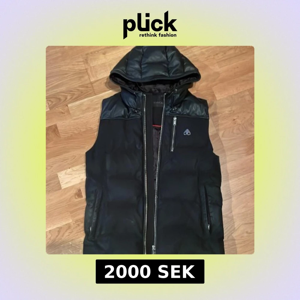 Svart dunväst från Moose Knuckles (Storlek S men passar M) med huva och detaljer i skinnimitation över axlar och huva. Västen har två sidofickor med dragkedja, en bröstficka med dragkedja och logga på bröstet. Stängs med en kraftig dragkedja framtill.