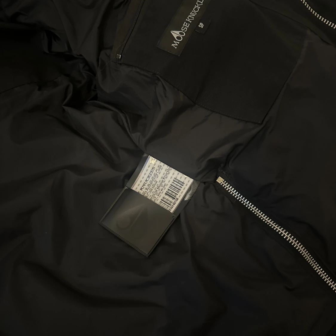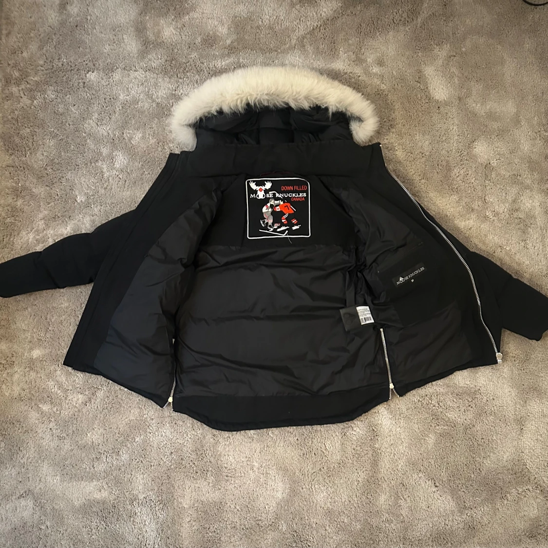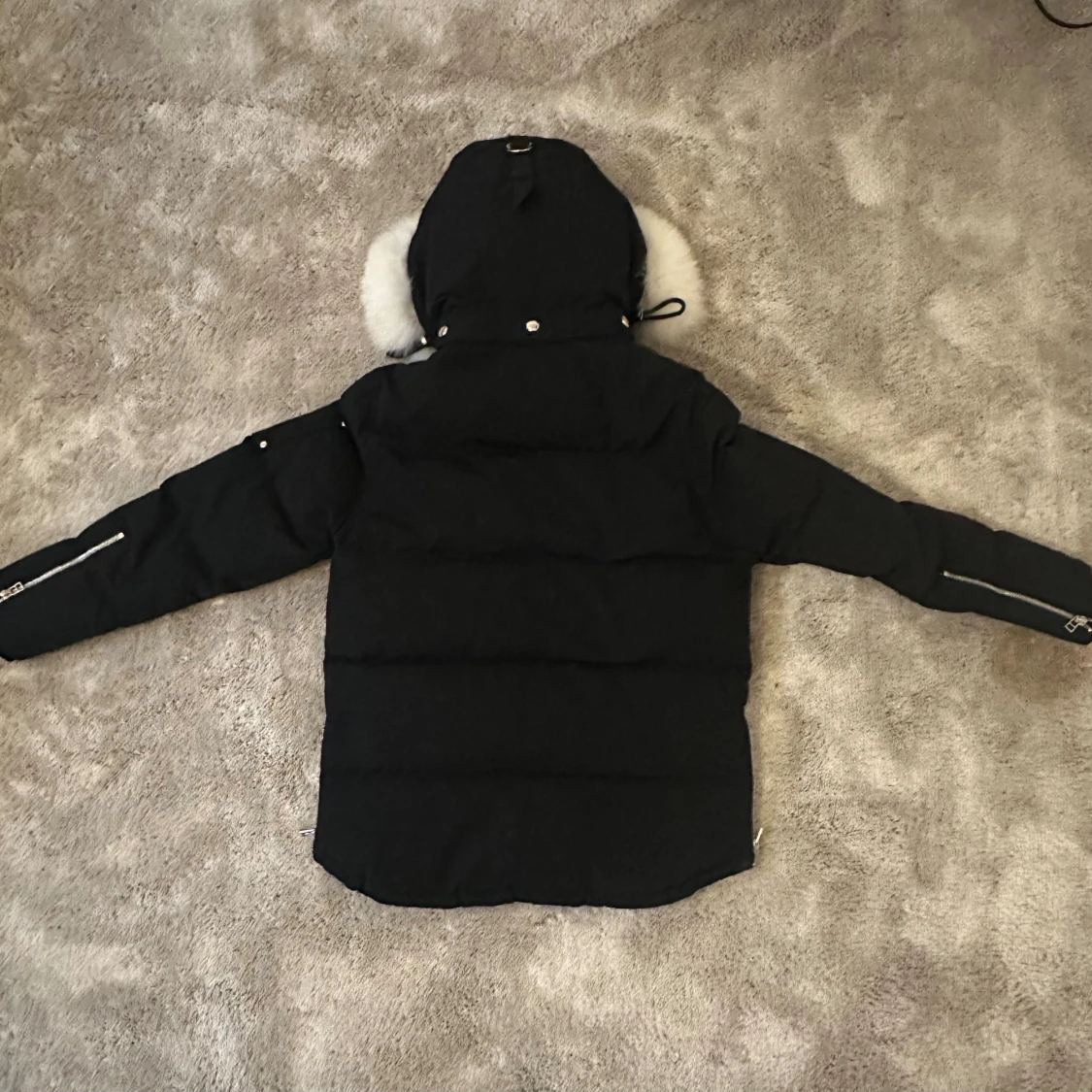 Svart jacka från Moose Knuckles med fluffig vit päls runt huvan. Jackan har långa ärmar med dragkedjor, flera fickor med knappar och snygga silverdetaljer. Perfekt för kalla dagar med sin tjocka och quiltade design. Stilsäker look med coola detaljer.