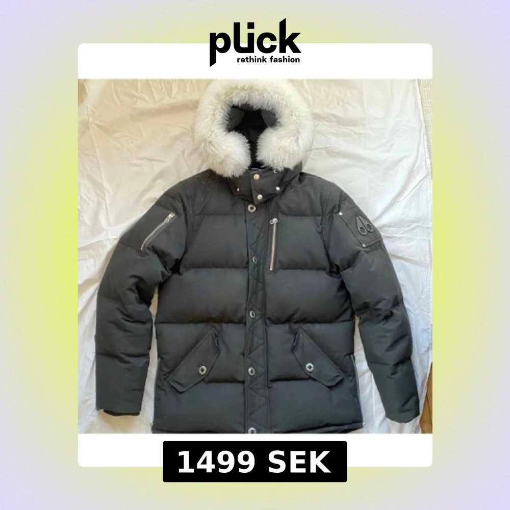 Säljer en svart dunjacka från Moose Knuckles med fet vit päls runt huvan. Jackan har flera fickor med både dragkedja och knappar, samt snygga metalldetaljer på ärmen och axeln. Perfekt för kalla dagar. Dragkedjan funkar precis som den ska bara att dragtappen saknas