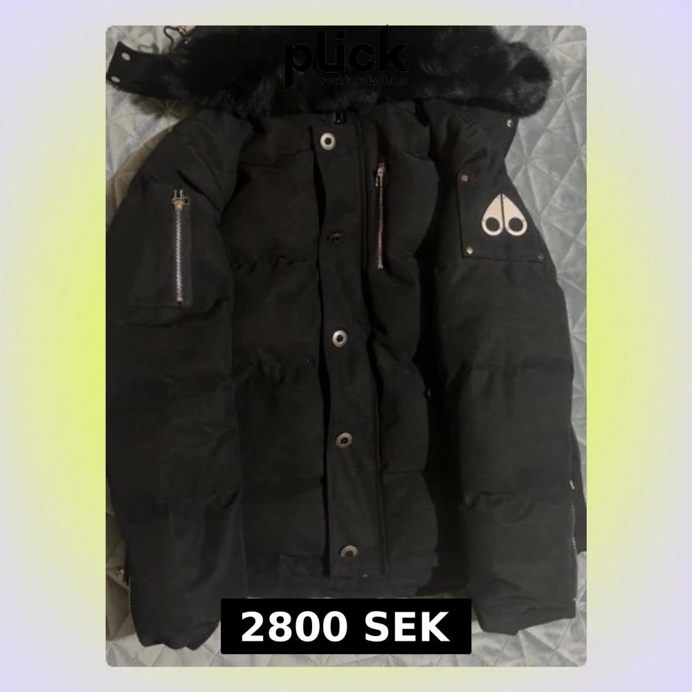 Säljer en svart pufferjacka från Moose Knuckles med fet päls på huvan, silvriga dragkedjor och metallpatch på ärmen. Jackan har broderad insida med hockeymotiv och snygga detaljer som stora knappar och fickor. Perfekt för dig som vill ha en varm och stilren vinterjacka. Passar de som har storlek L då mosse knuckles är liten i storlek