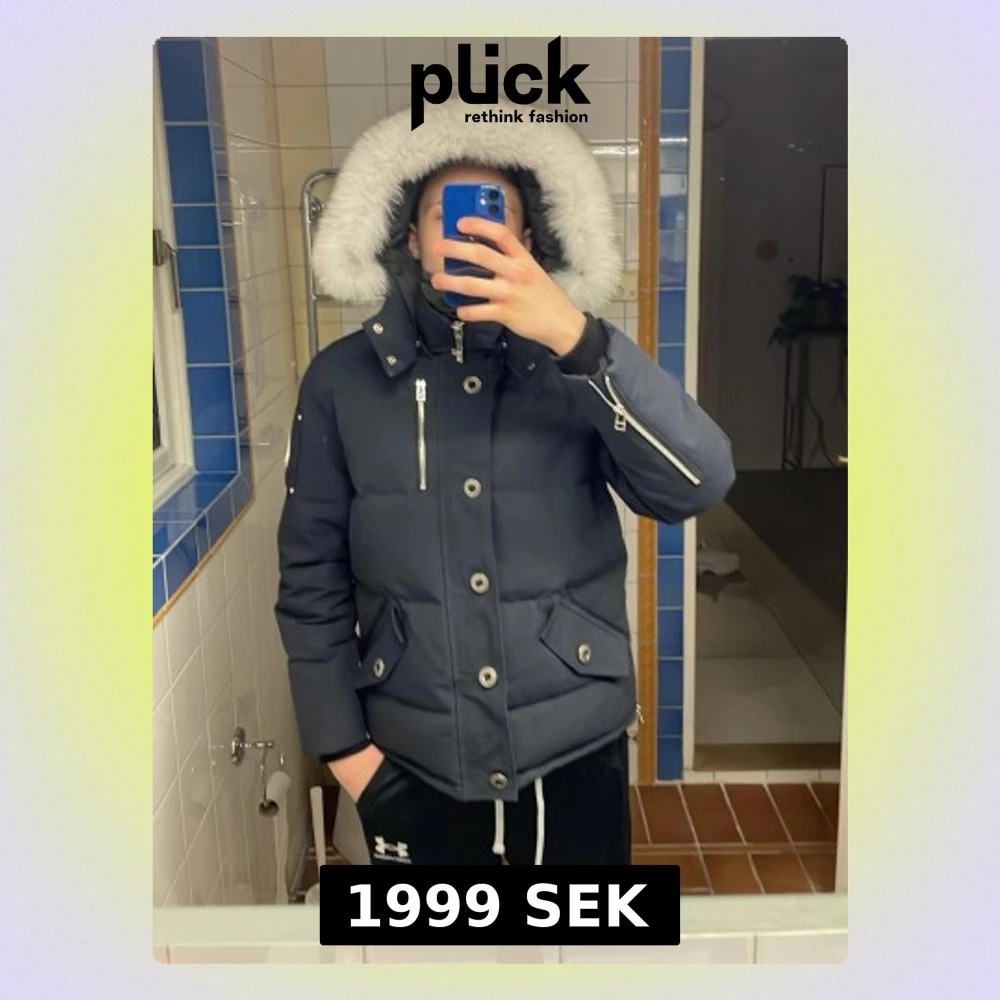 Säljer en marinblå dunjacka från Moose Knuckles med lyxig vit päls runt huvan och coola metalldetaljer på ärmen. Jackan har flera dragkedjor och broderad insida med hockeymotiv. Perfekt för kalla dagar när du vill hålla stilen.
