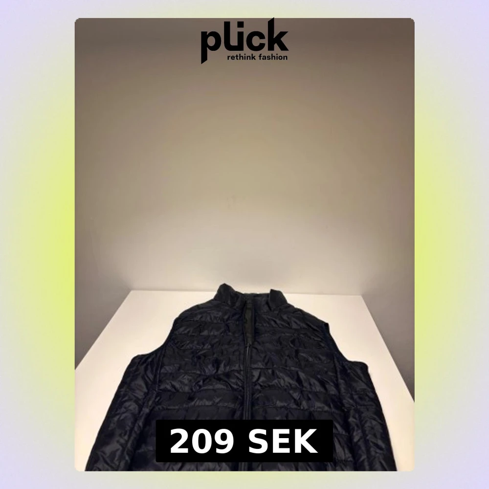 Svart dunväst med quiltad design och hög krage. Västen har en hel dragkedja framtill och är tillverkad i ett glansigt syntetmaterial. Perfekt att slänga över en hoodie för extra värme under kyliga dagar. Helt ny.