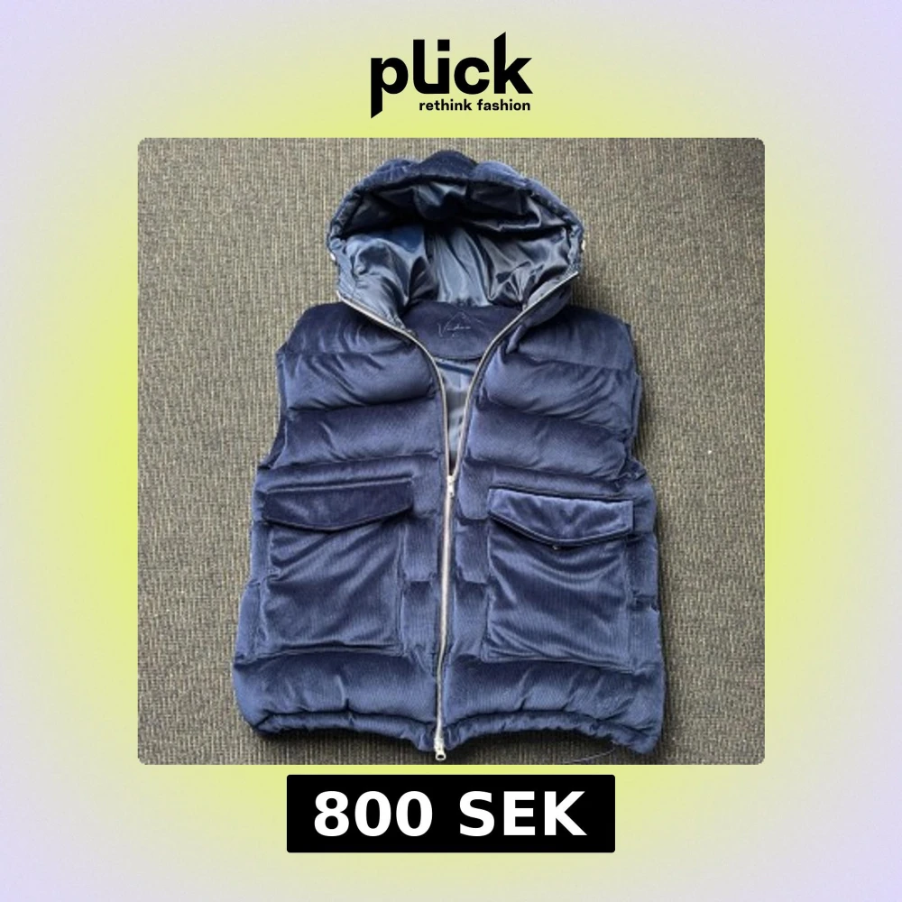 Snygg mörkblå dunväst i mjuk manchester. Västen har en vadderad look, stor huva, två stora fickor framtill och dragkedja hela vägen. Perfekt för lager-på-lager och ger en cool vibe till din outfit. Saknar 1 knapp för den högra fickan. Anars bra skick i storlek L.