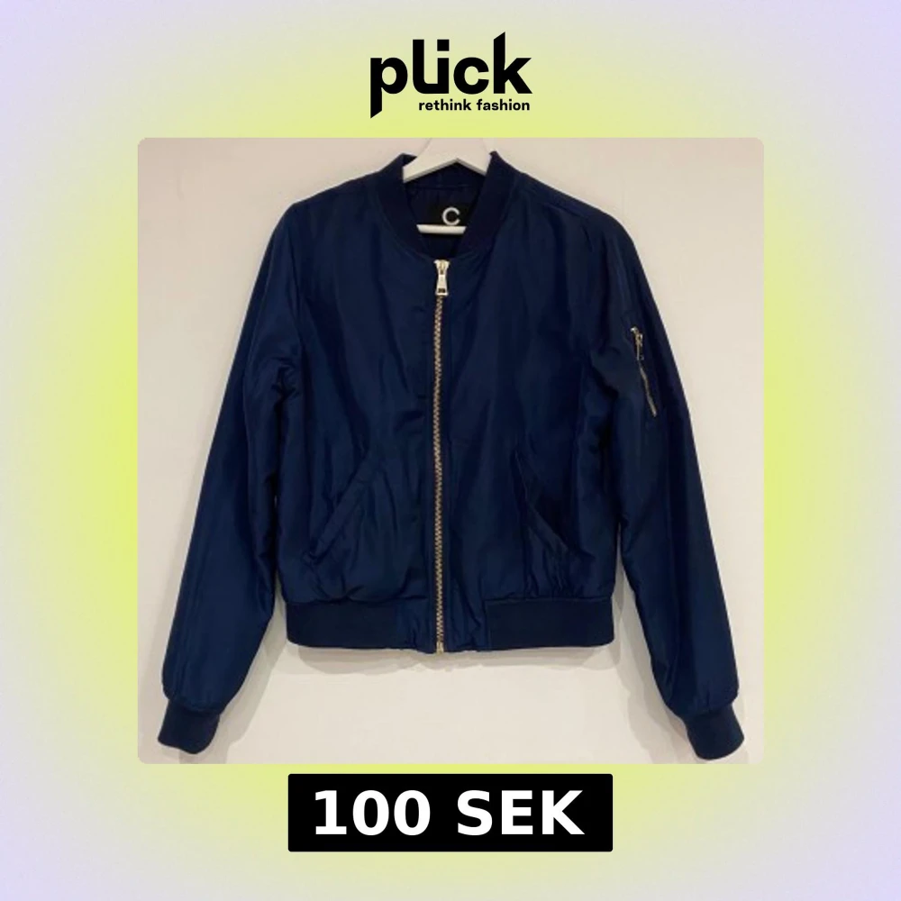 Snygg mörkblå bomberjacka med guldiga dragkedjor. Storlek S