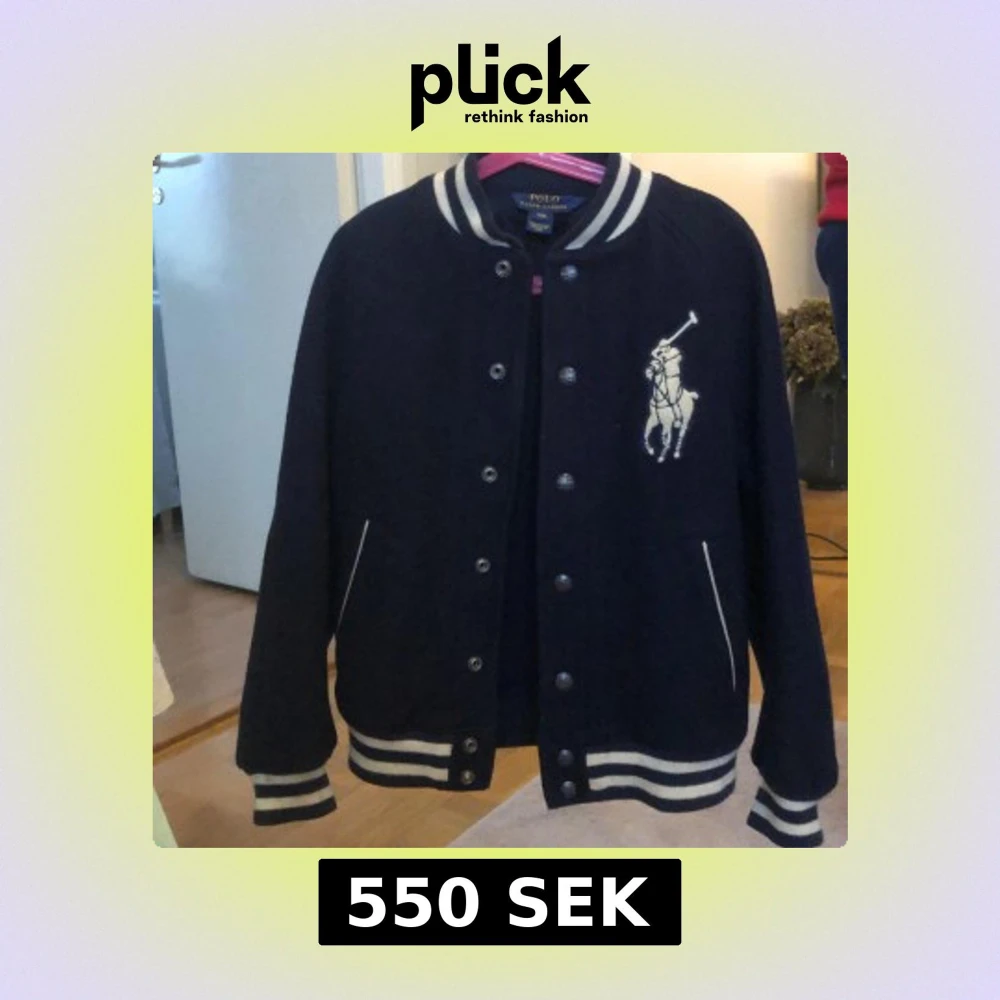 Säljer en mörkblå bomberjacka från Polo Ralph Lauren med vita ränder på muddar och krage. Jackan har knappar framtill, två fickor och en stor broderad logga på bröstet. Klassisk och sportig stil.