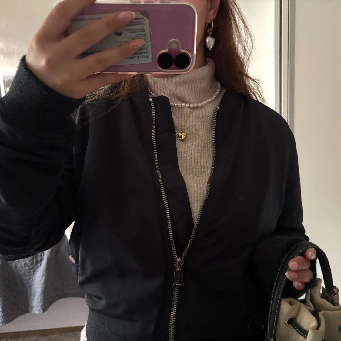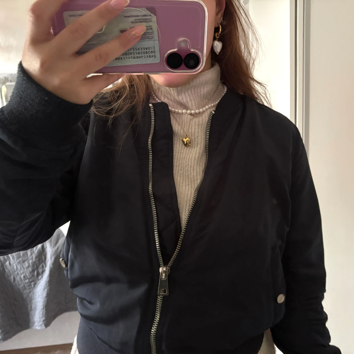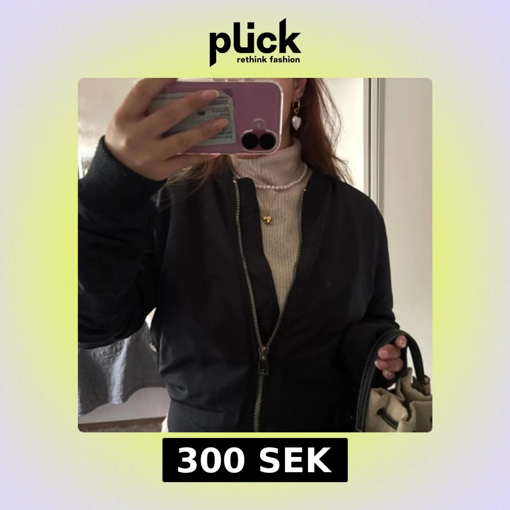 Säljer en mörkblå bomberjacka med klassisk siluett och silverfärgad dragkedja framtill. Jackan har ribbade muddar vid ärmslut och midja, samt sidofickor med tryckknapp. Perfekt för dig som gillar en clean och stilren look.