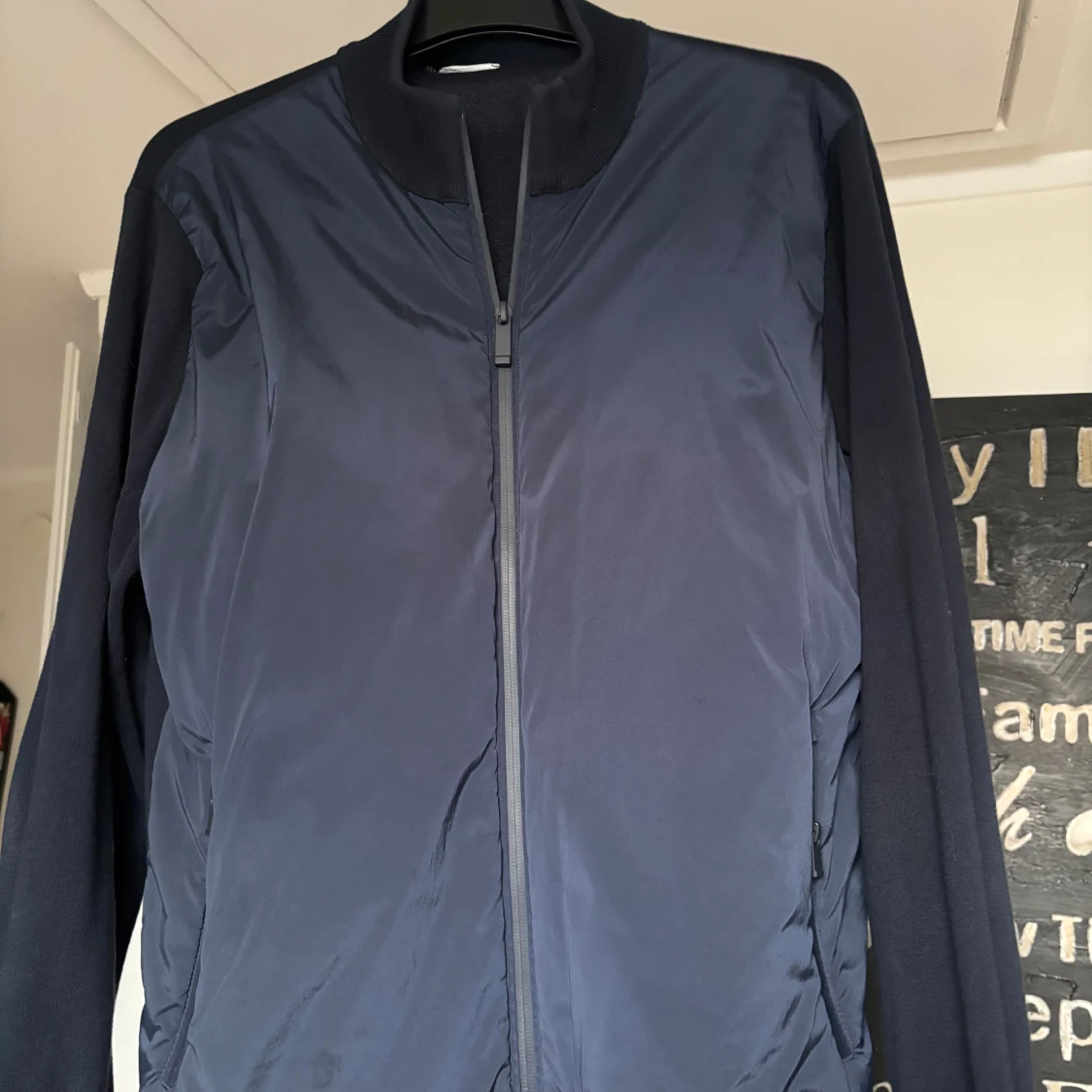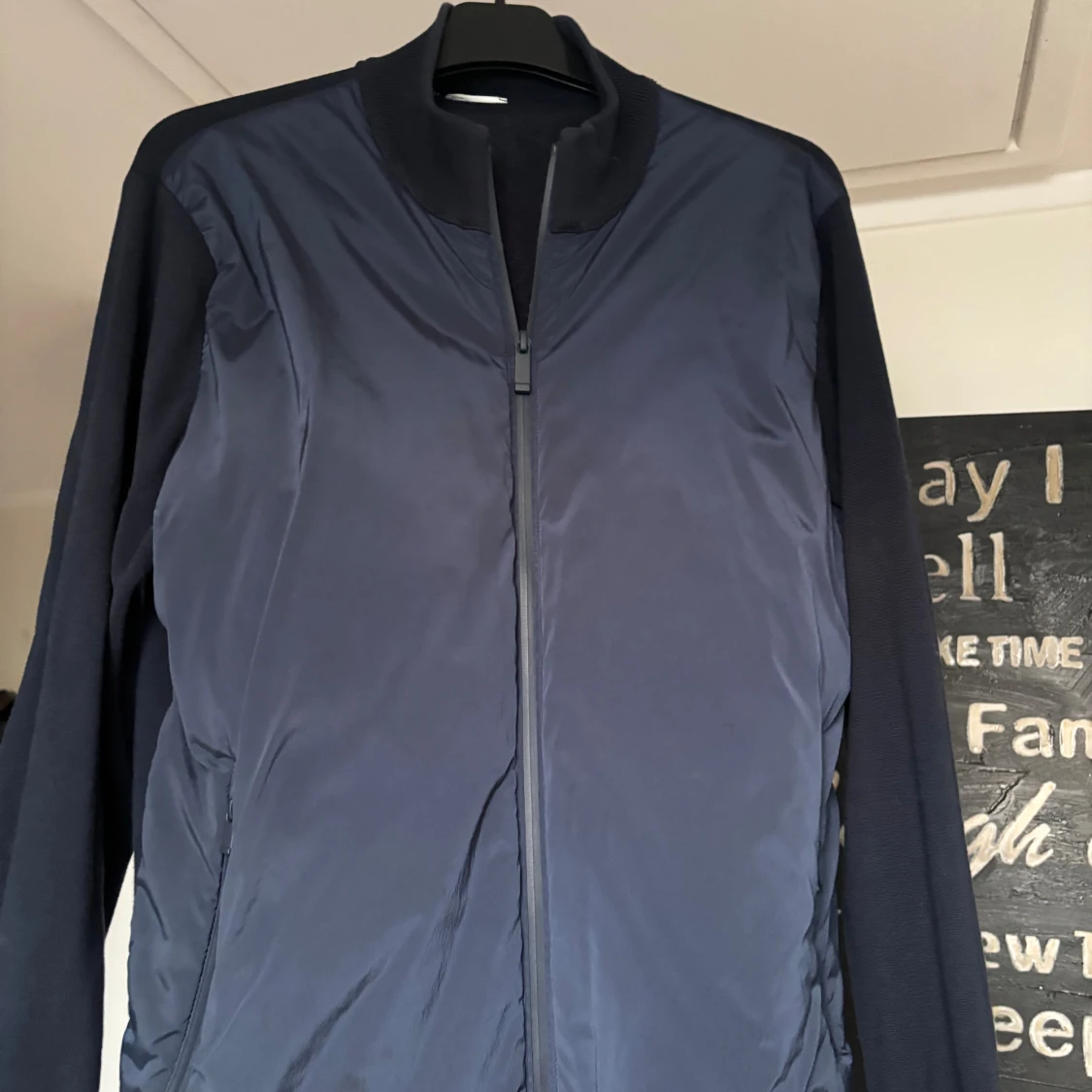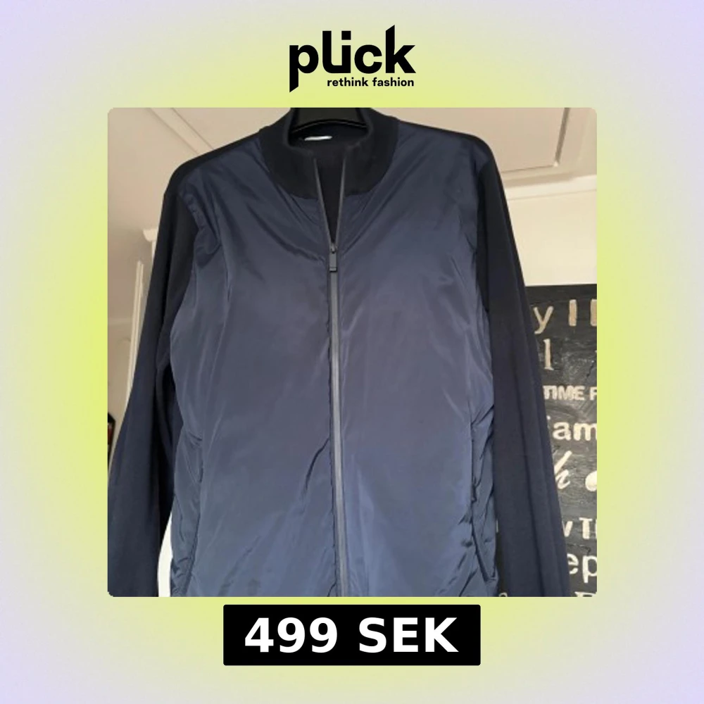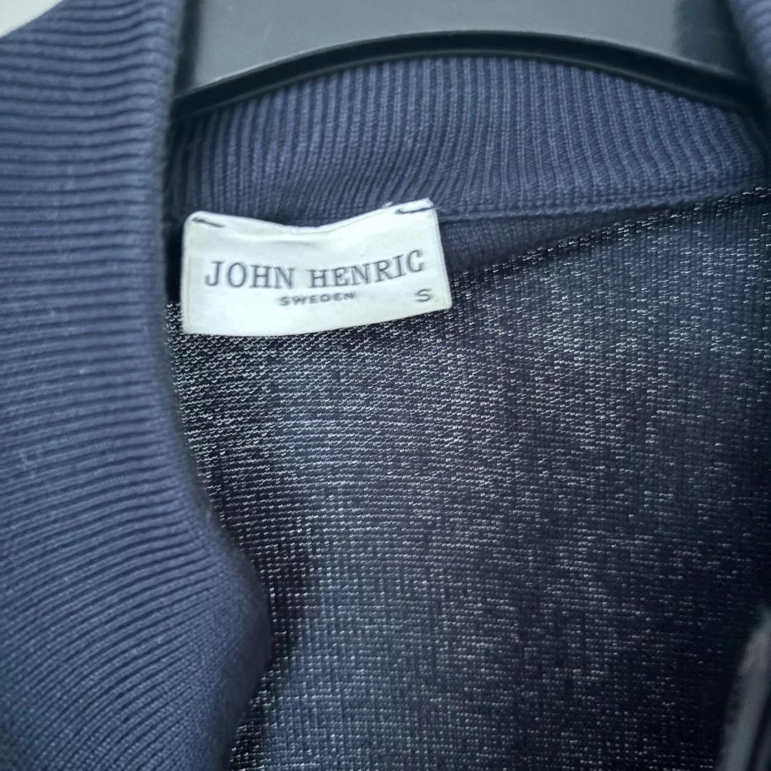 Snygg mörkblå Cardigan från John Henric i storlek S. Jackan har en stilren design med ribbad krage och ärmar, hel dragkedja framtill och slät yta. Materialet är en mix av polyester och stickad tyg på ärmarna för extra komfort.