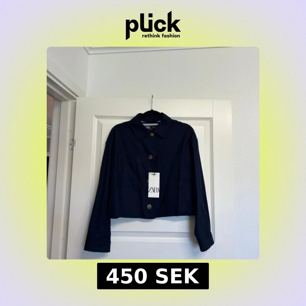 Snygg mörkblå croppad overshirt från Zara med klassisk krage och stora träknappar framtill. Jackan har långa ärmar med knappdetalj vid mudden och två stora fickor på bröstet. Materialet är linne, vilket ger en chill och lätt känsla.Ny med prislapp på. Aldrig använt bara provat.