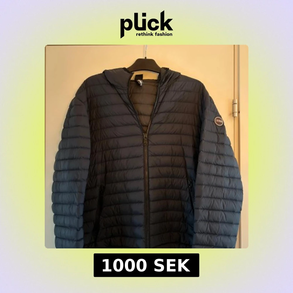 Snygg mörkblå dunjacka från Colmar med huva och dragkedja. Jackan har ett quiltat mönster och en rund logotyp på ärmen. Perfekt för kyliga dagar.