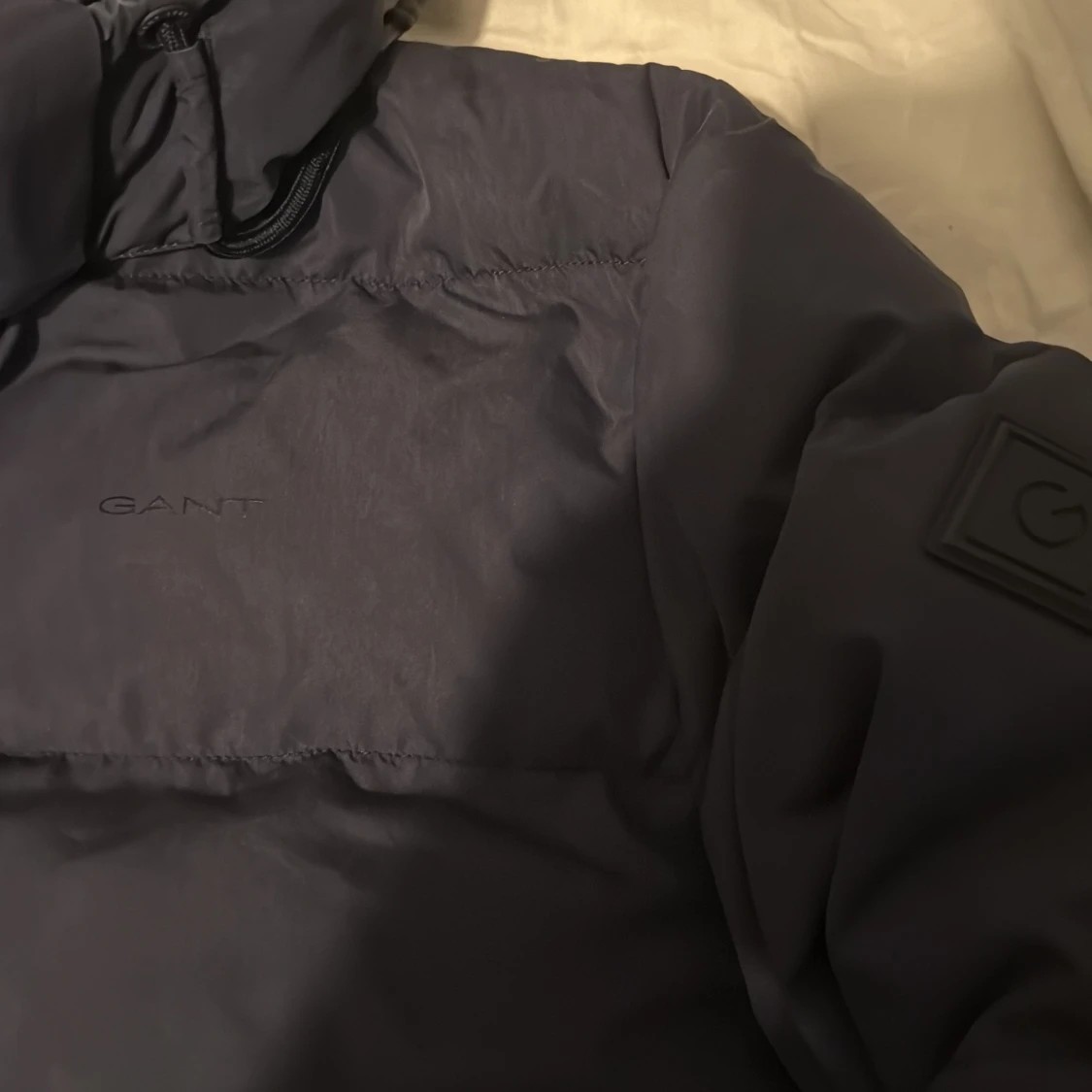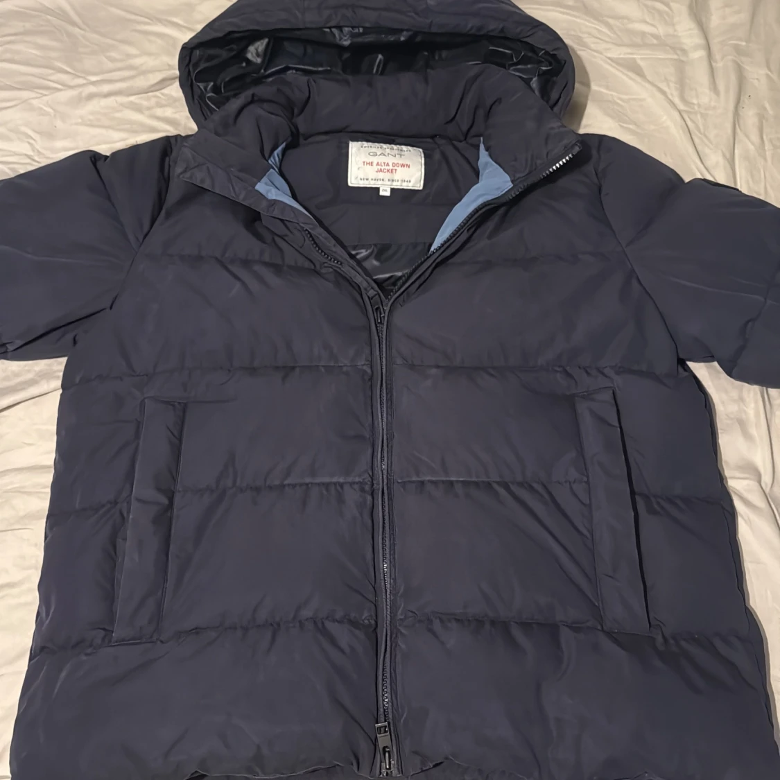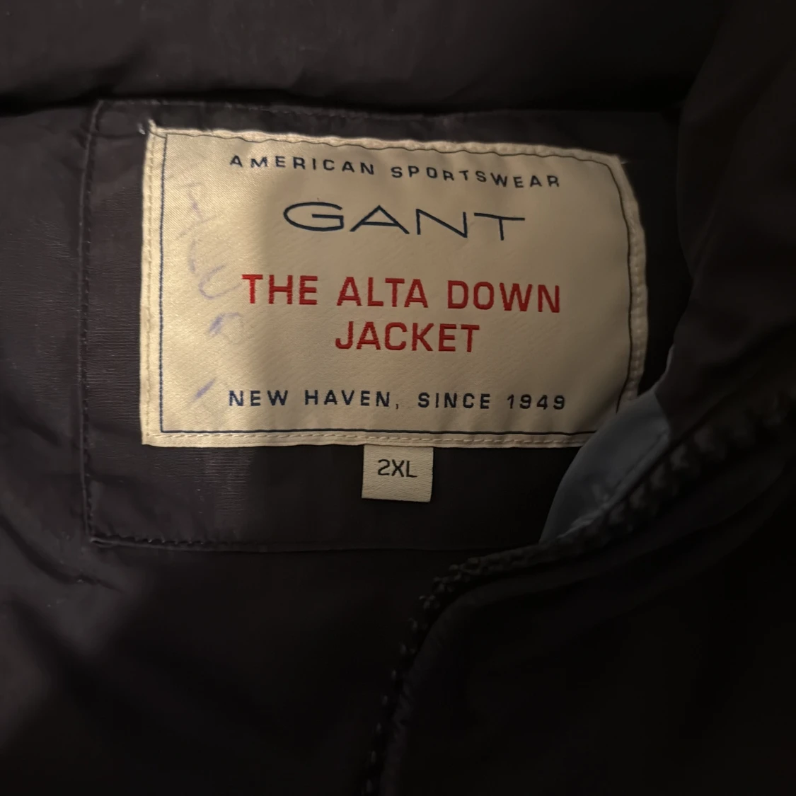 Säljer en mörkblå dunjacka från GANT, modell The Alta Down Jacket. Jackan har huva, två stora fickor och dragkedja framtill. Perfekt för kalla dagar med sin puffiga design och stilrena look. GANT-logga på bröstet och patch på ärmen. Storlek 2Xl