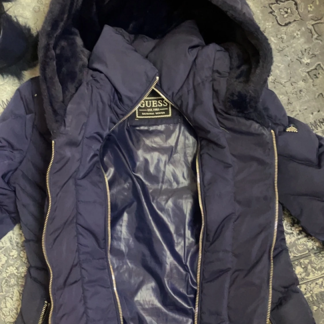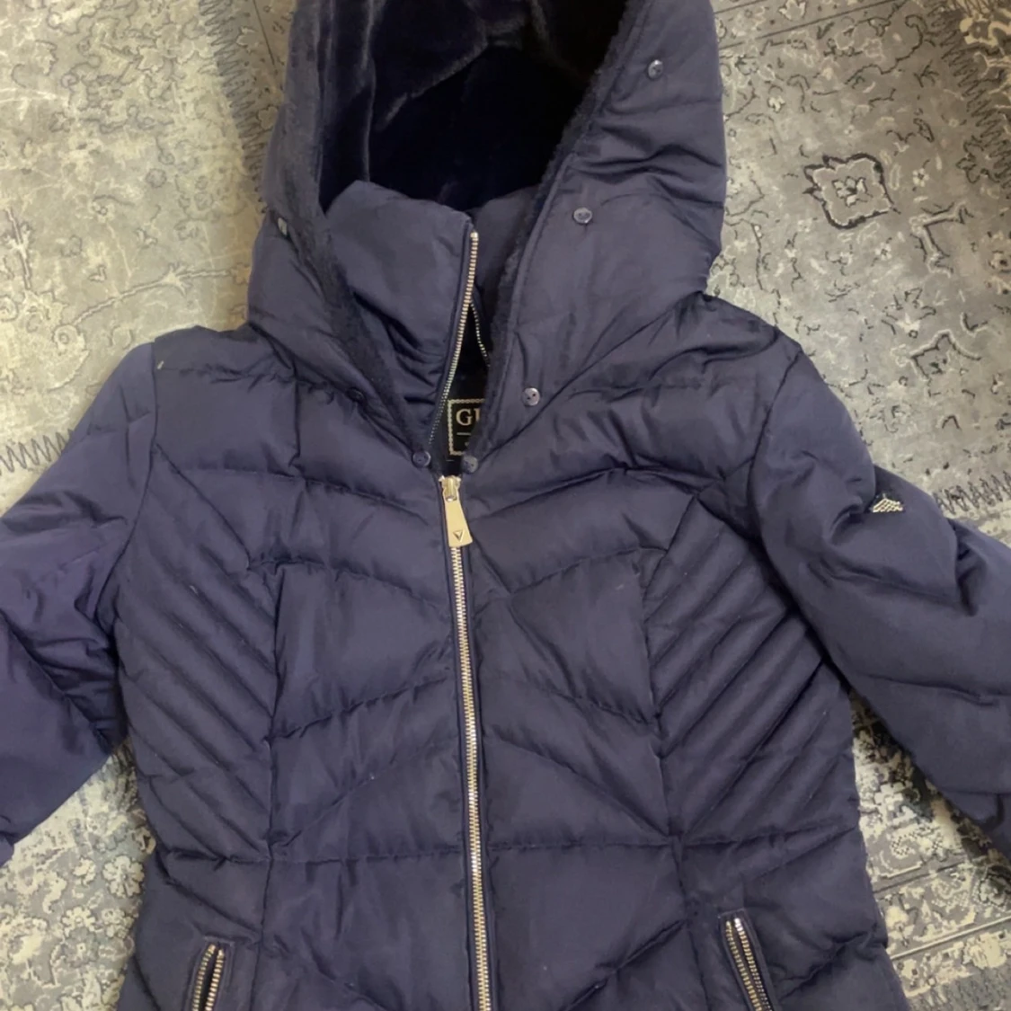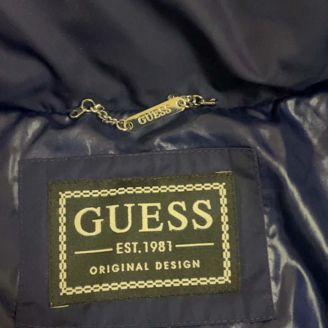 Säljer en snygg mörkblå dunjacka från Guess i nytt skick. Jackan har en mysig huva och stängs med dragkedja samt päls om man vill ha det. Perfekt för kalla vinterdagar! 💙