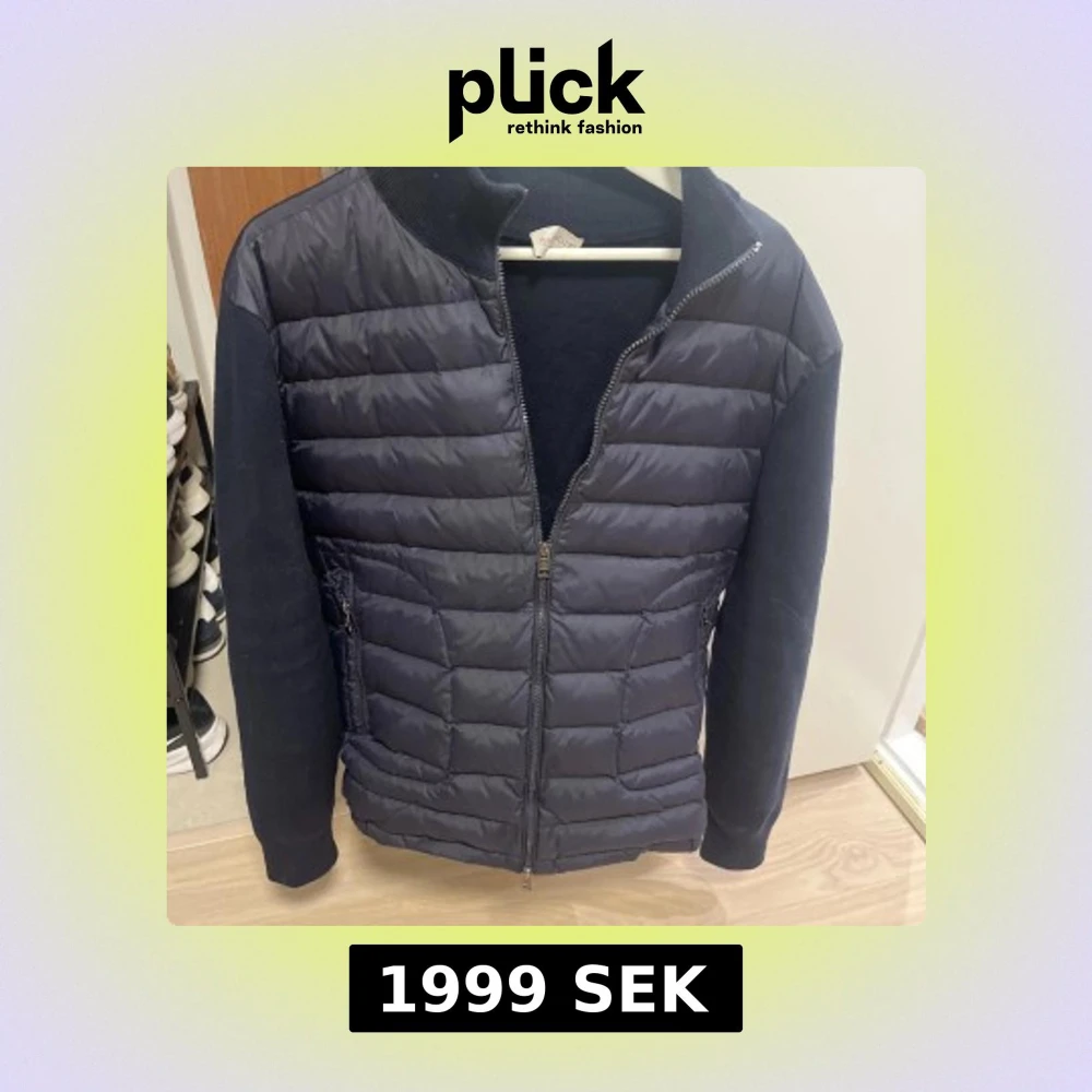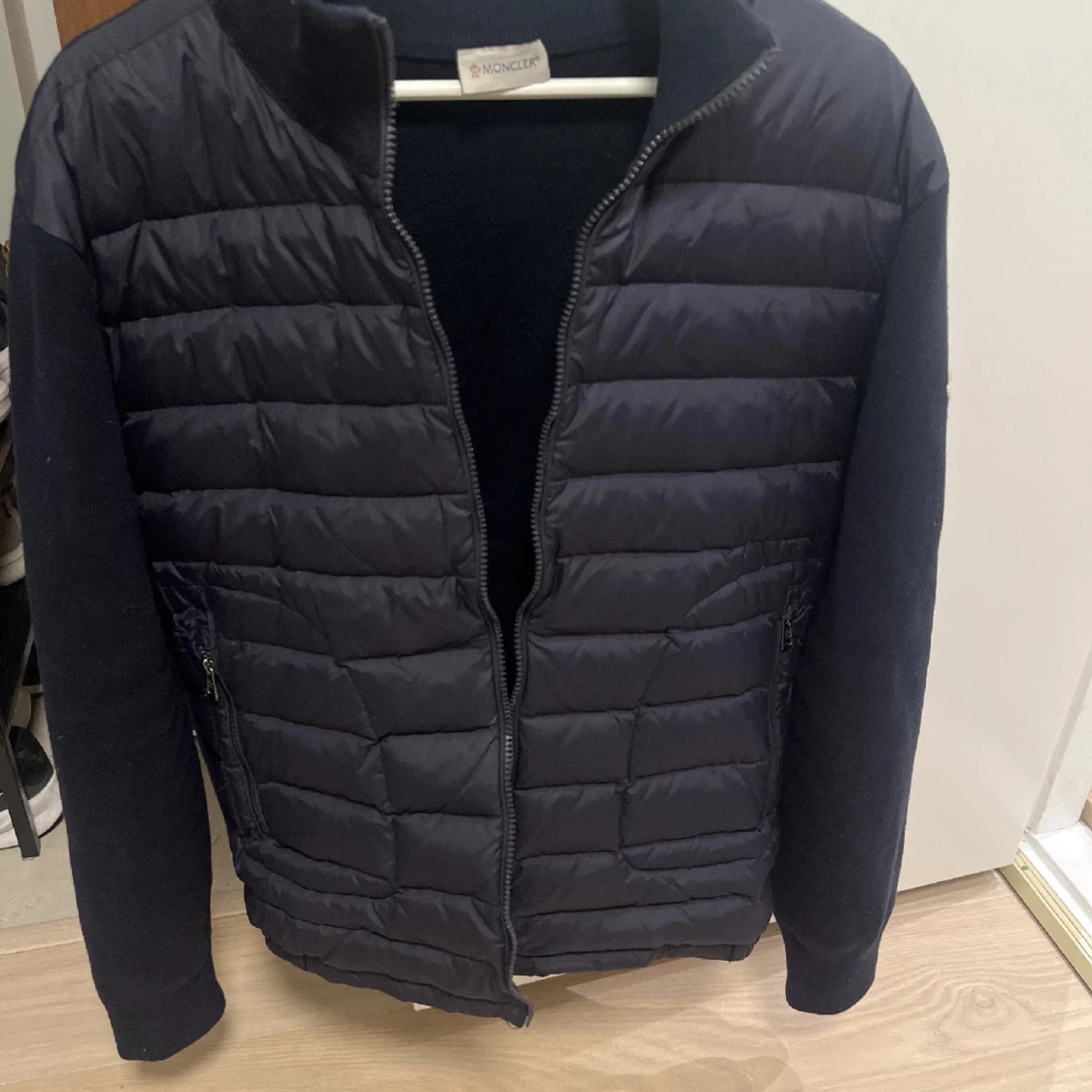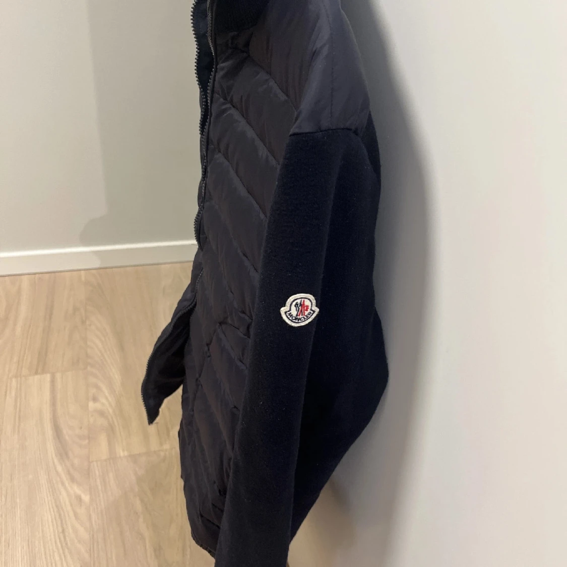 Snygg svart dunjacka från Moncler med quiltad front och stickade ärmar. Jackan har dragkedja framtill, Moncler-logga på ärmen och ribbad krage. Perfekt för dig som vill ha en stilren och bekväm jacka med exklusiv känsla.