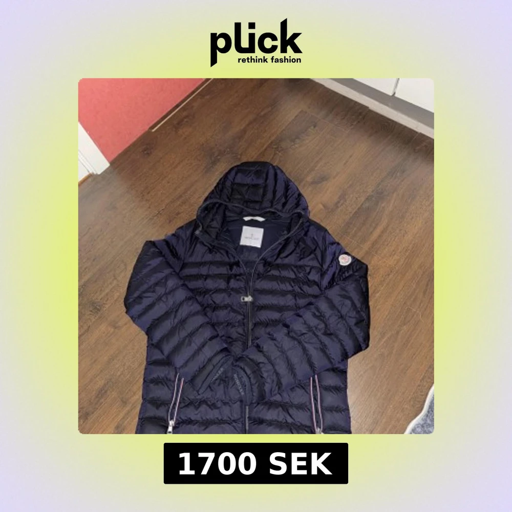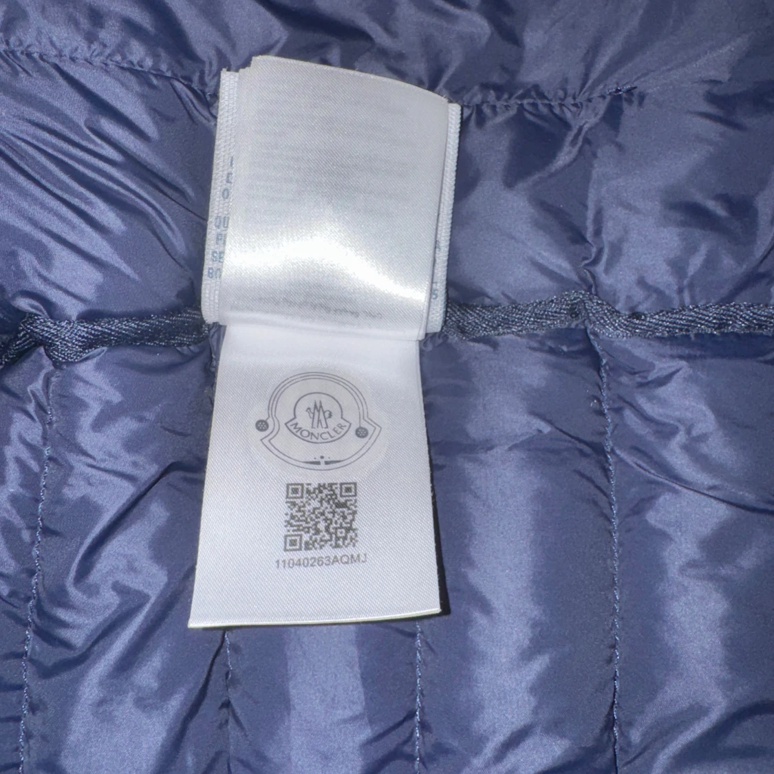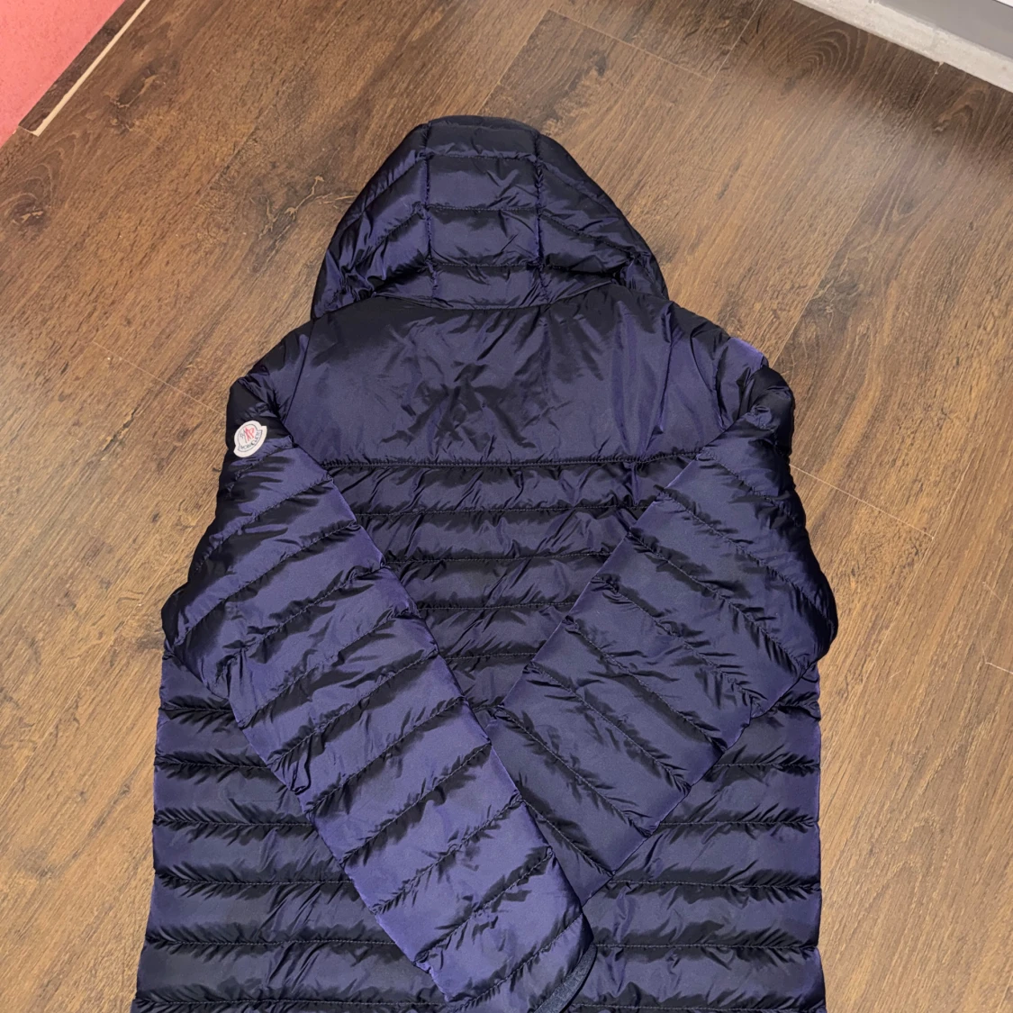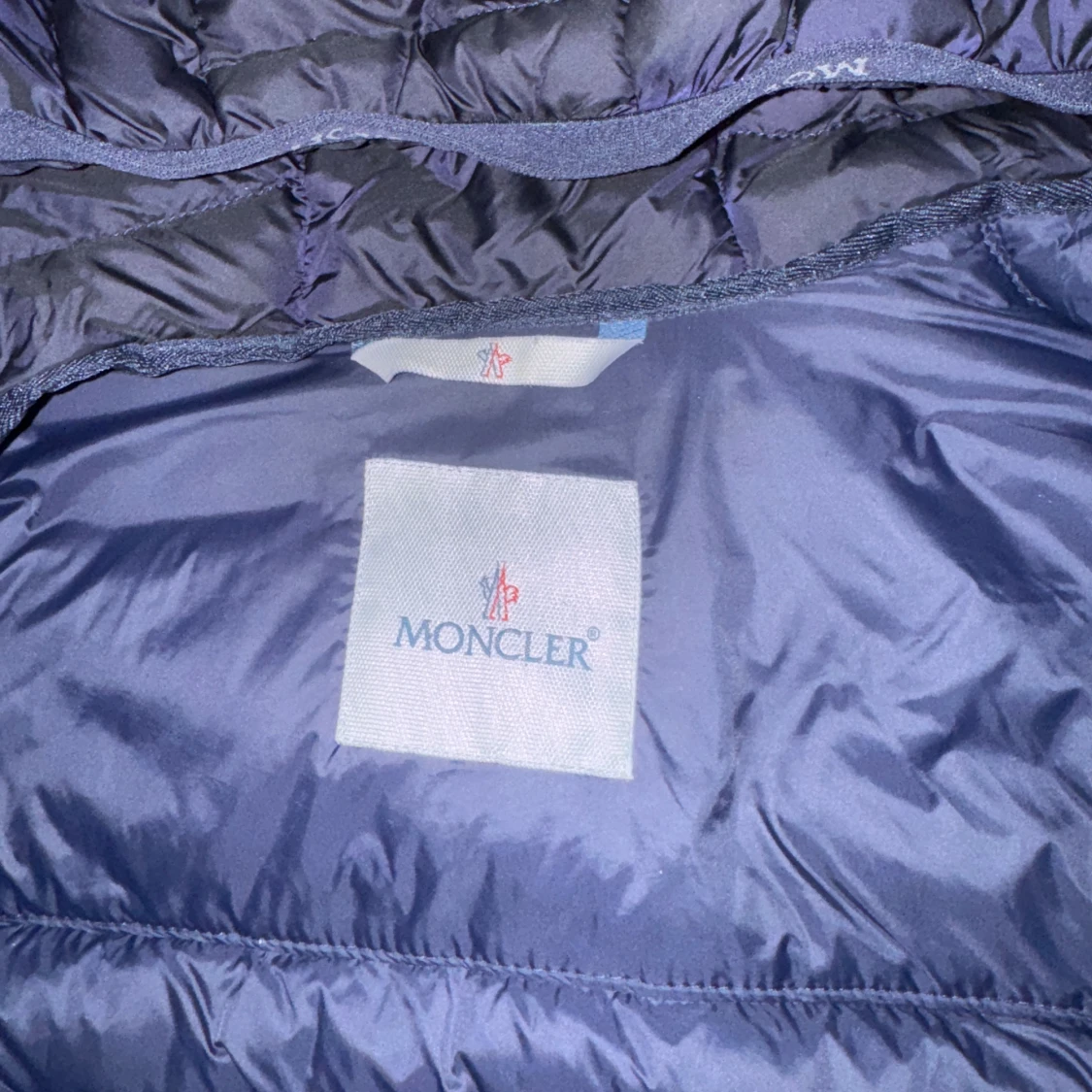 Snygg mörkblå dunjacka från Moncler med huva och dragkedja framtill. Jackan har klassisk quiltad design, Moncler-logga på ärmen och två fickor med dragkedja. Perfekt för kyliga dagar och riktigt stilren look.
