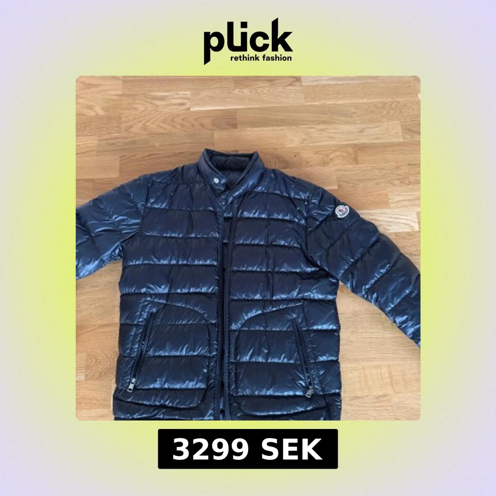 Snygg mörkblå dunjacka från Moncler med quiltad design och hög krage. Jackan har dragkedja framtill, två fickor med dragkedja och ikonisk Moncler-logga på ärmen. Fylld med vitt gåsdun för extra värme och lätt känsla. Perfekt för kalla dagar och stilrena outfits.