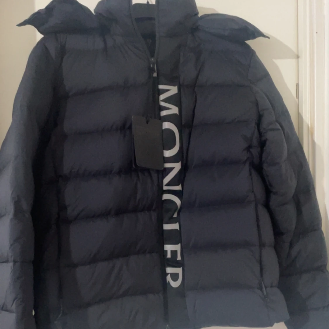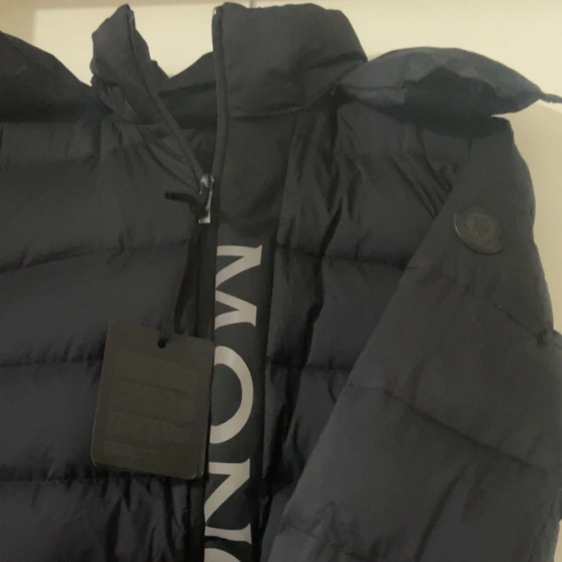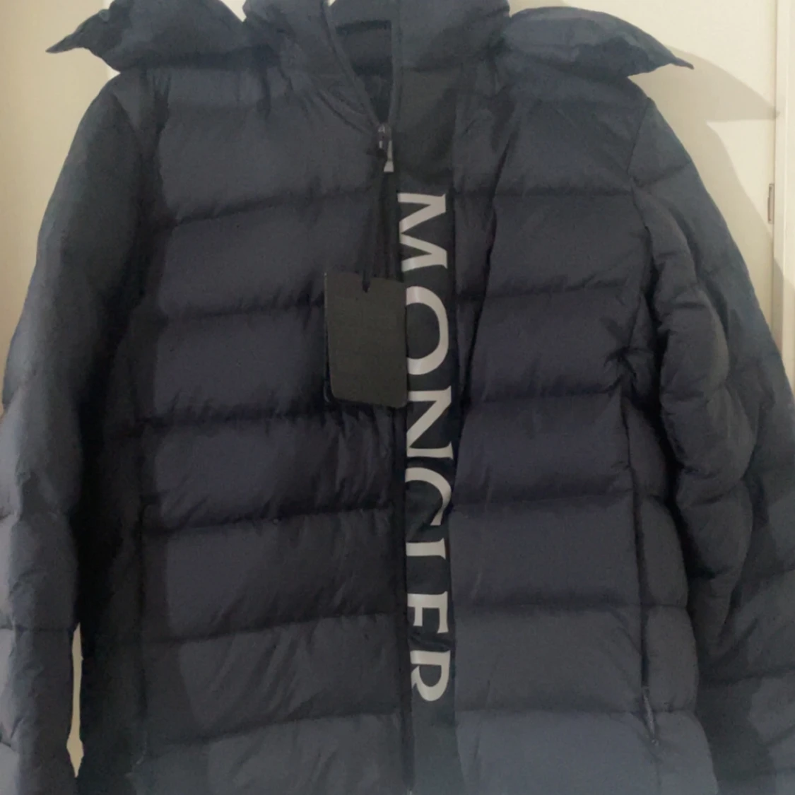 Snygg och varm mörkblå dunjacka från Moncler med dragkedja och huva. Perfekt för kyliga dagar med sin quiltade design och långa ärmar. Moncler-logga synlig på framsidan. Storlek M passar L pris kan diskuteras