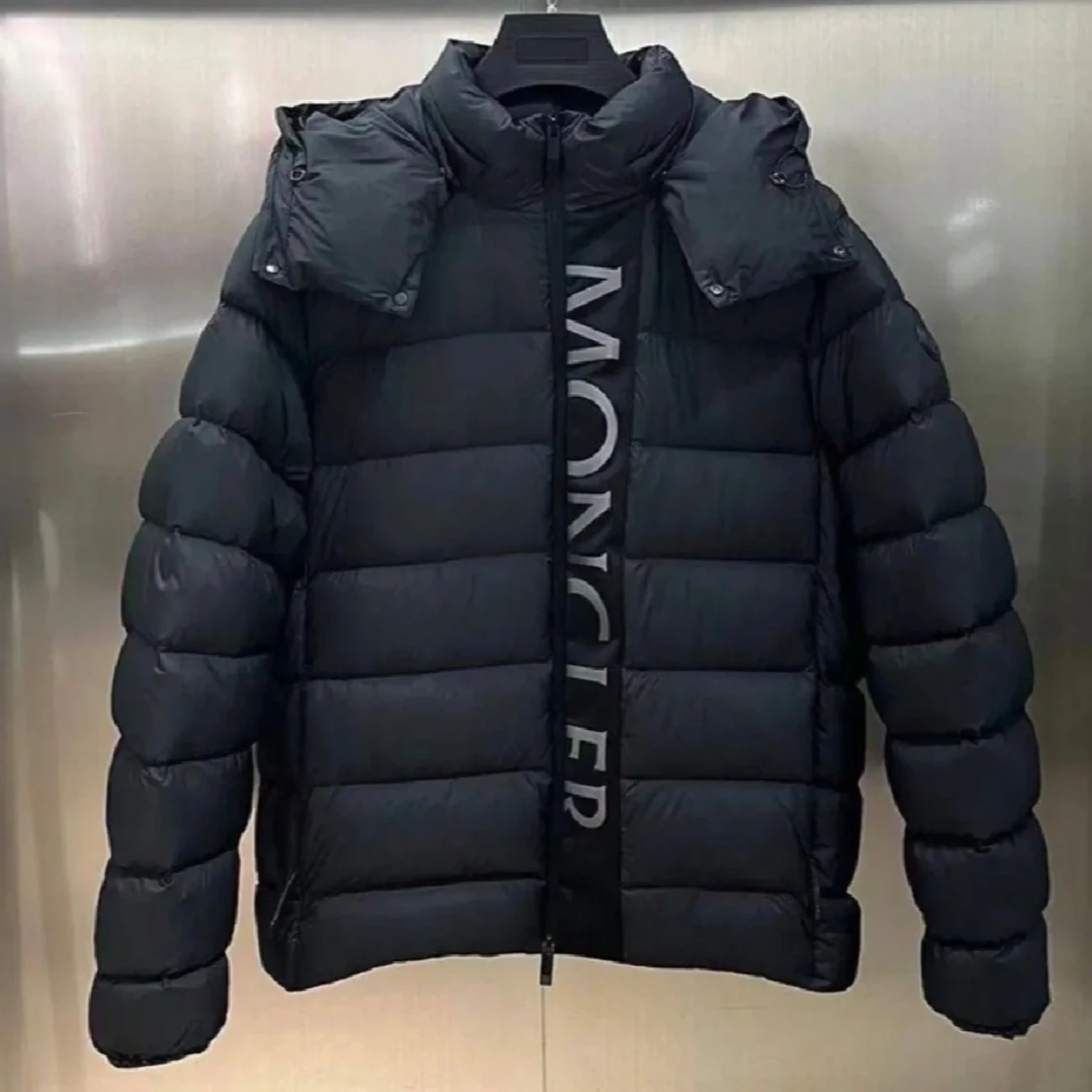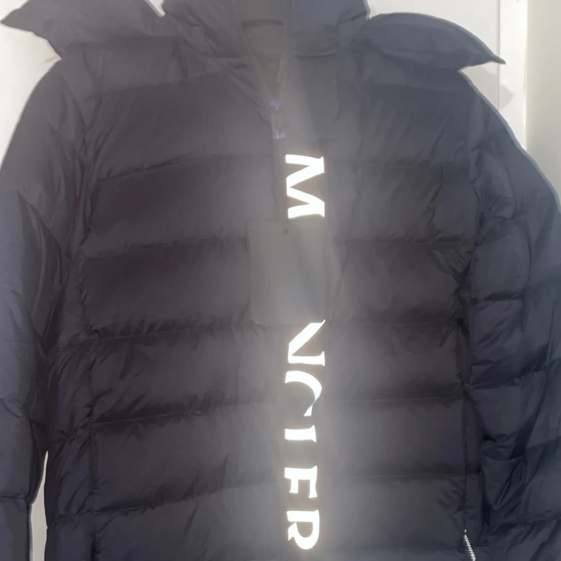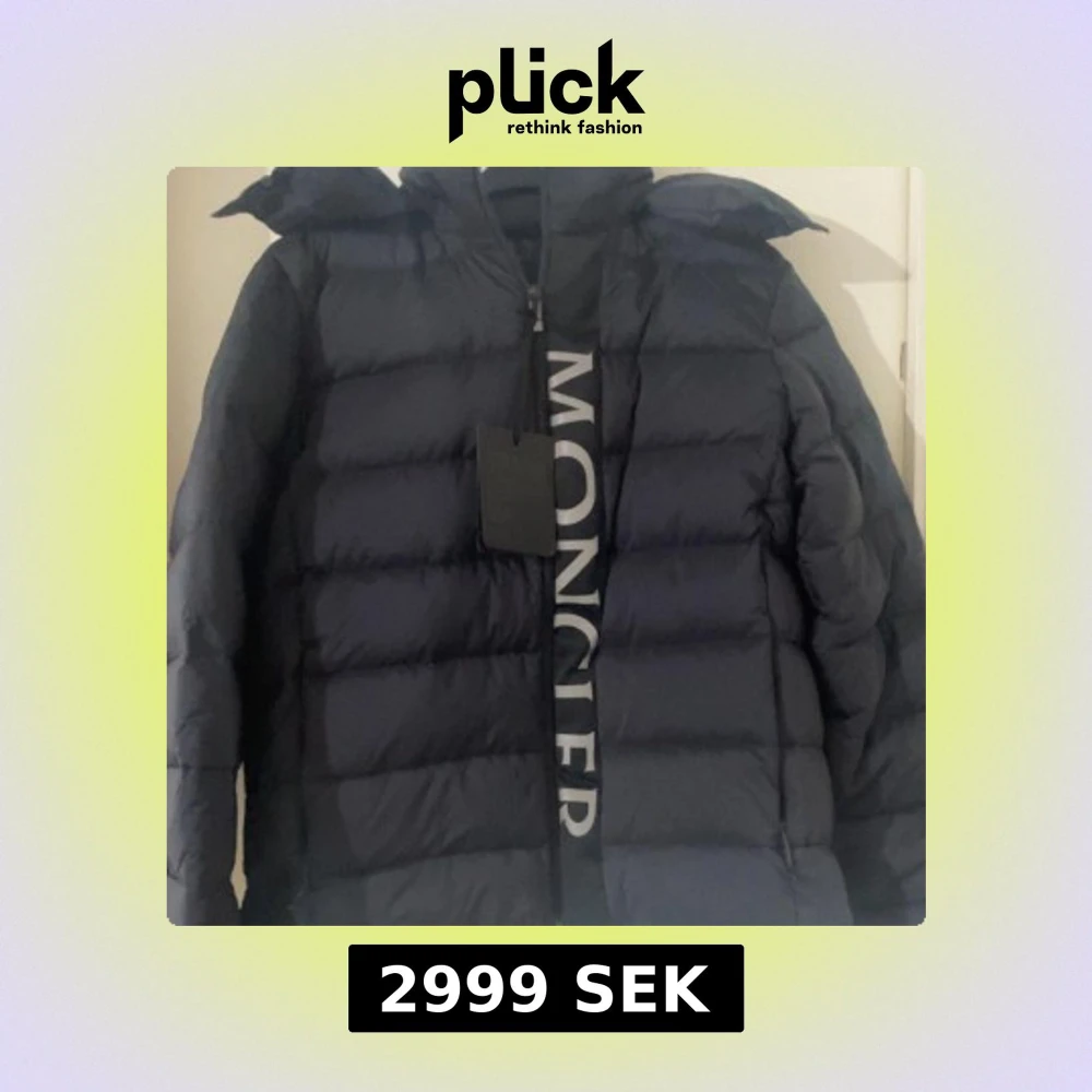 Snygg och varm mörkblå dunjacka från Moncler med dragkedja och huva. Perfekt för kyliga dagar med sin quiltade design och långa ärmar. Moncler-logga synlig på framsidan. Storlek M passar L pris kan diskuteras