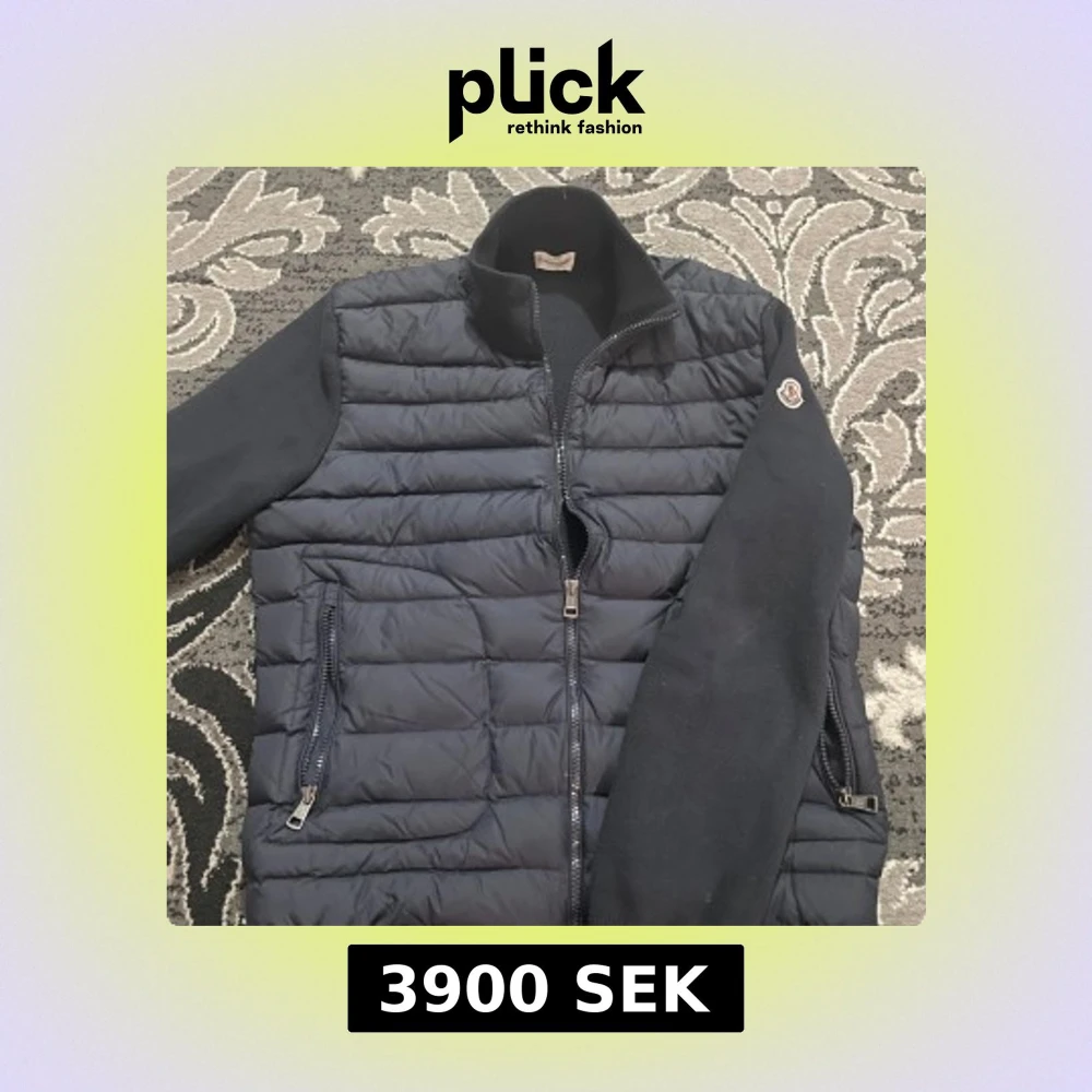 Säljer en snygg mörkblå dunjacka från Moncler med quiltad design och dragkedja. Jackan har långa ärmar och en stilren look med Moncler-logga på ärmen. Perfekt för kyligare dagar.