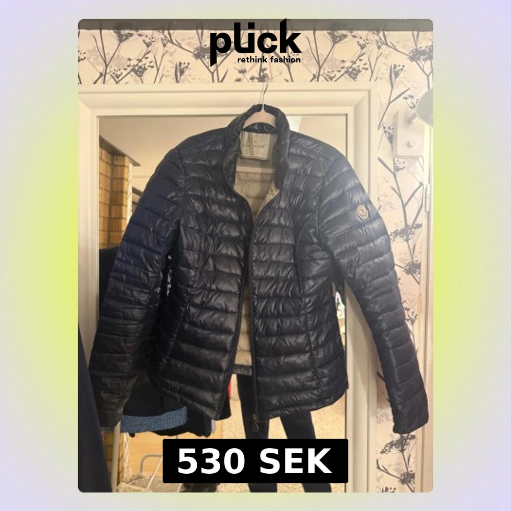 Snygg mörkblå dunjacka från Moncler med klassisk logga på ärmen. Jackan har quiltad design, dragkedja framtill och hög krage. Lätt och smidig att bära, perfekt för kyliga dagar. Insidan är ljusbeige och jackan har långärmad passform. Jag köpte denna av en tjej på vinted för 2 veckor sedan. Men kommer ej ha användning för den. Vet inte exakt angående äkta därav priset. Luktade även lite ”instängt” om den när jag fick den. Passar xs/s