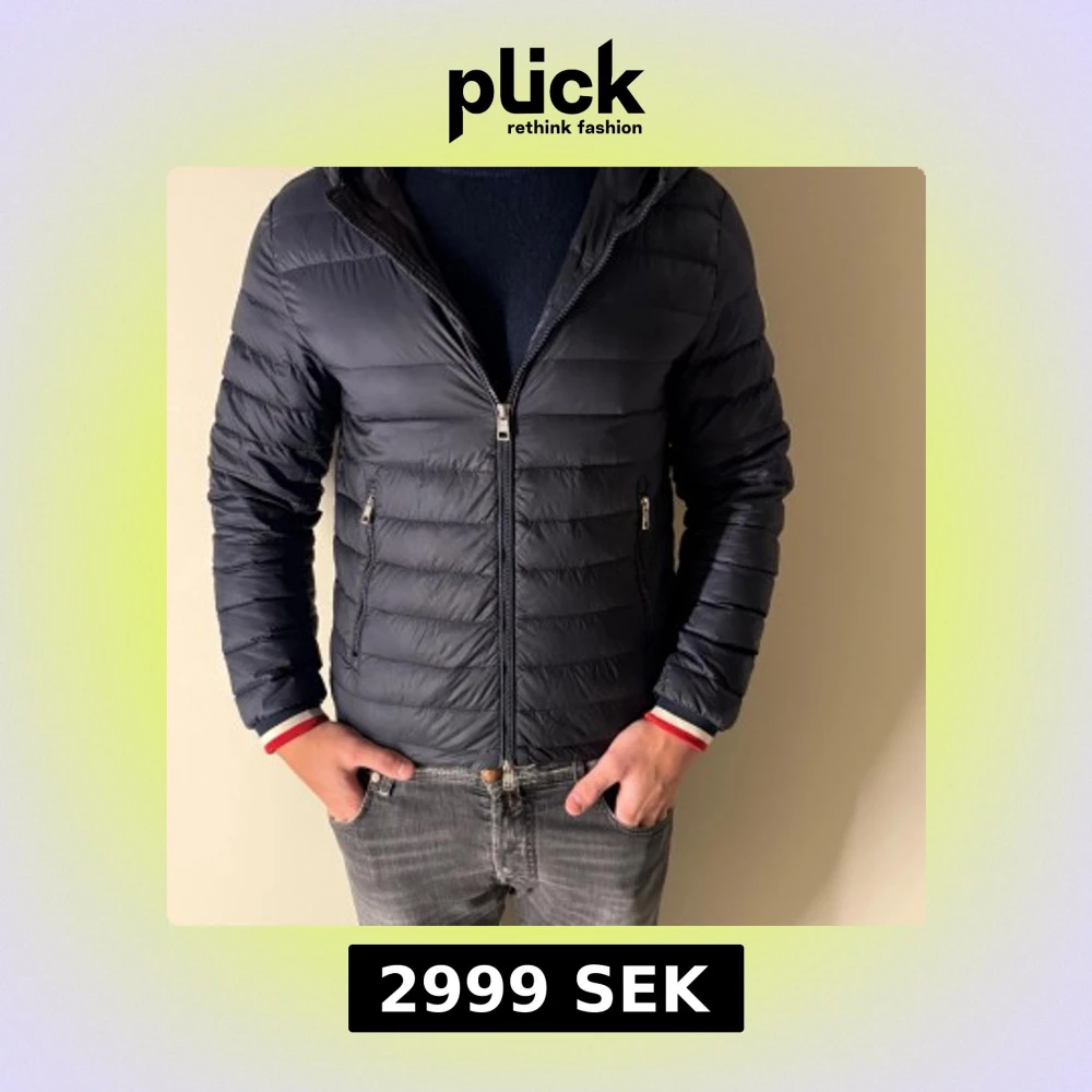 Snygg mörkblå dunjacka från Moncler med huva och klassisk logga på ärmen. Jackan har quiltad design, två sidofickor med dragkedja och coola detaljer i rött och vitt vid ärmsluten. Perfekt för kalla dagar och riktigt stilren look. Storlek 1 motsvarighet till XS - S.