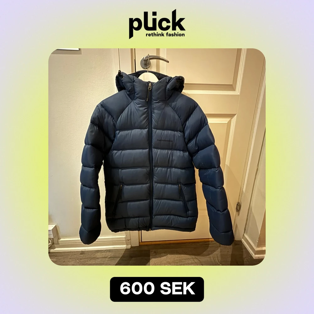 Säljer en snygg mörkblå dunjacka från Peak Performance. Jackan har en dragkedja framtill och en praktisk huva. Perfekt för kyliga dagar med sin vadderade design.
