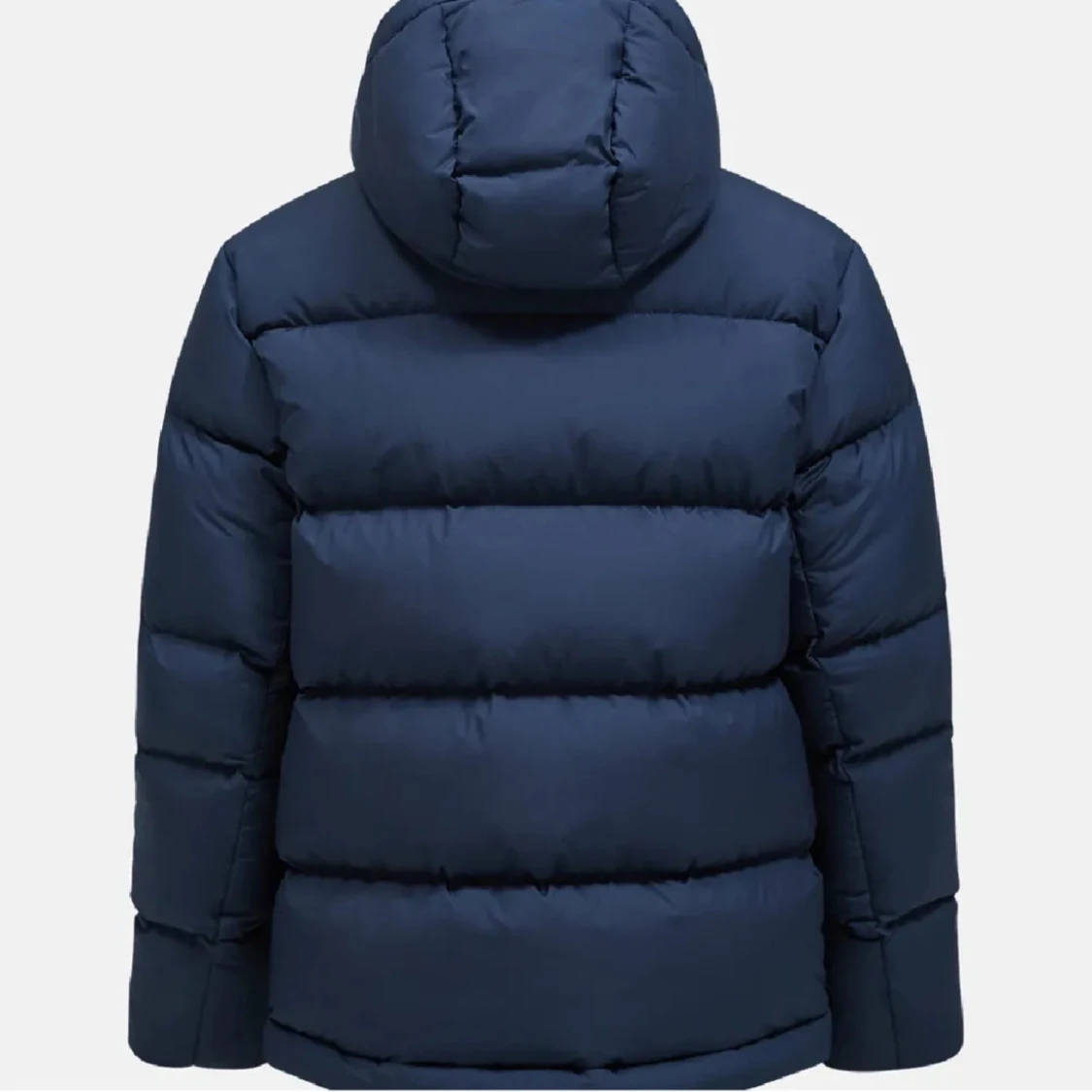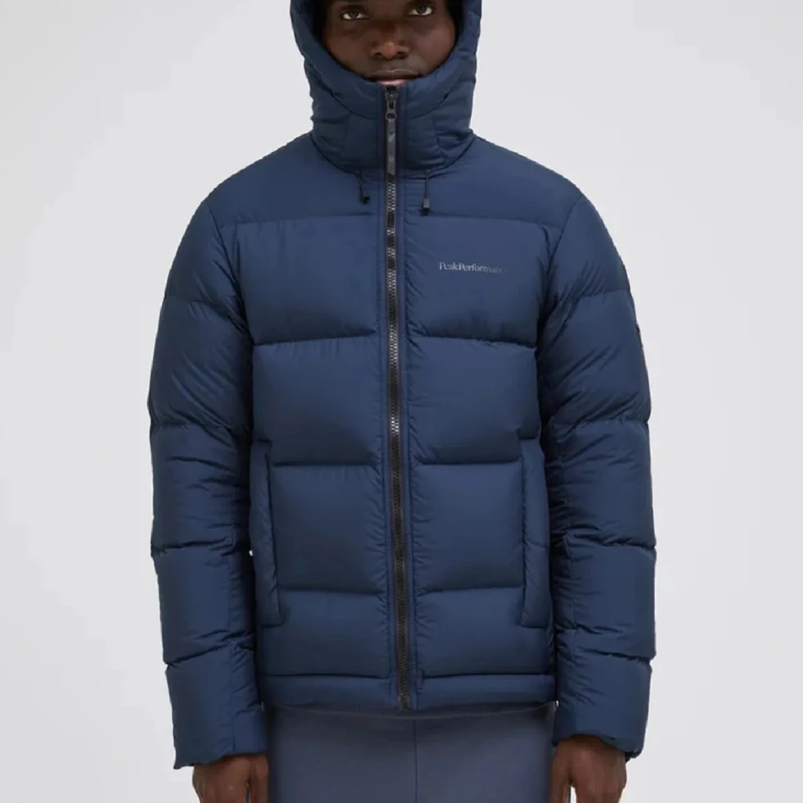 Mörkblå dunjacka från Peak Performance - Säljer en snygg mörkblå dunjacka från Peak Performance. Jackan har en huva och dragkedja framtill, perfekt för kyliga dagar. Den är vadderad och ger bra värmeisolering.