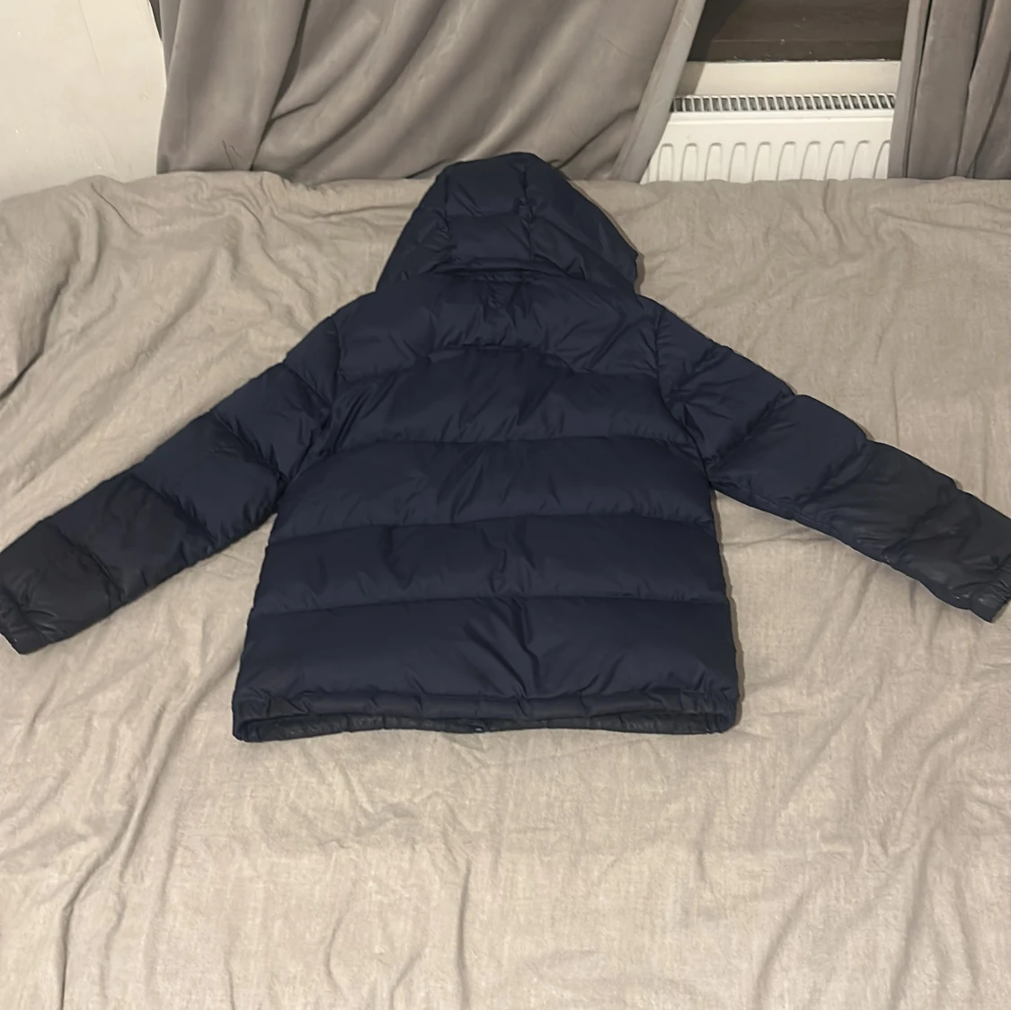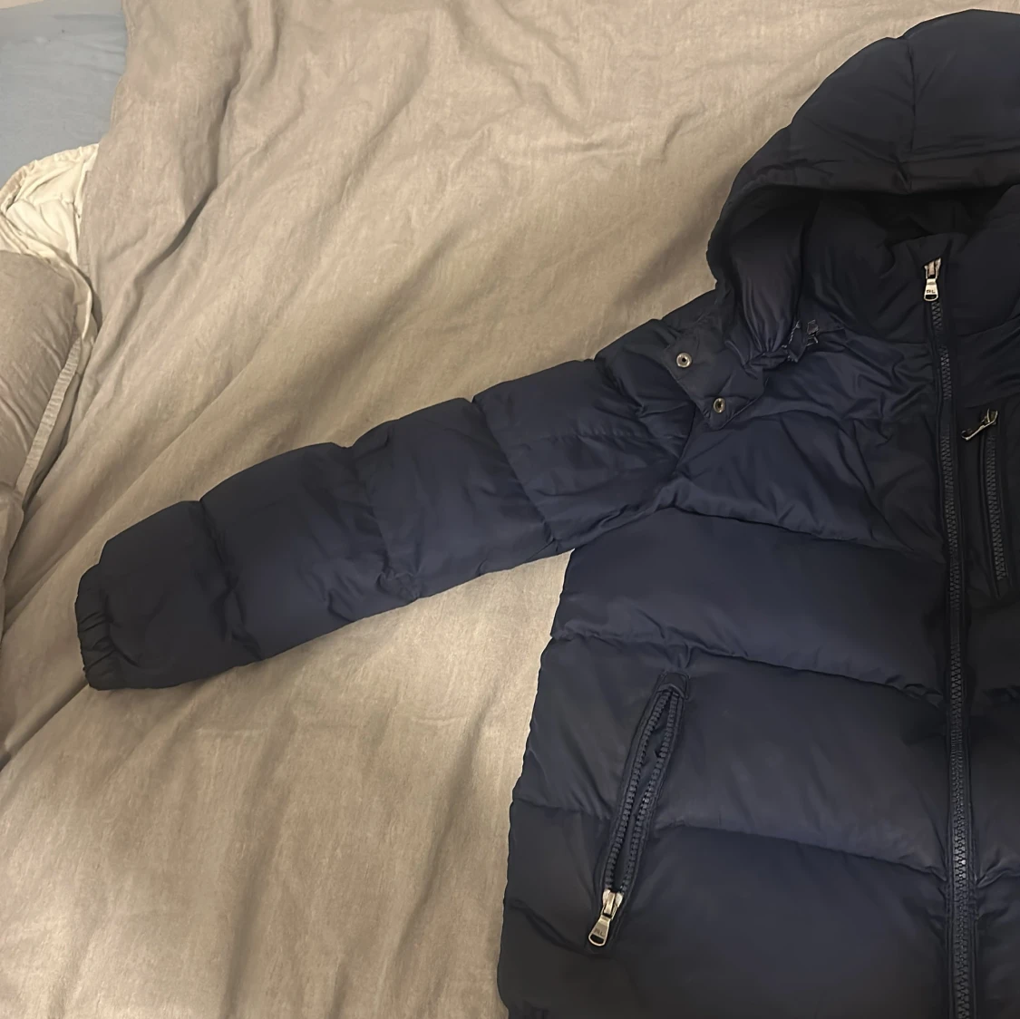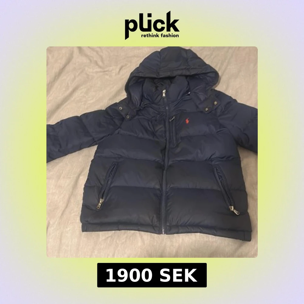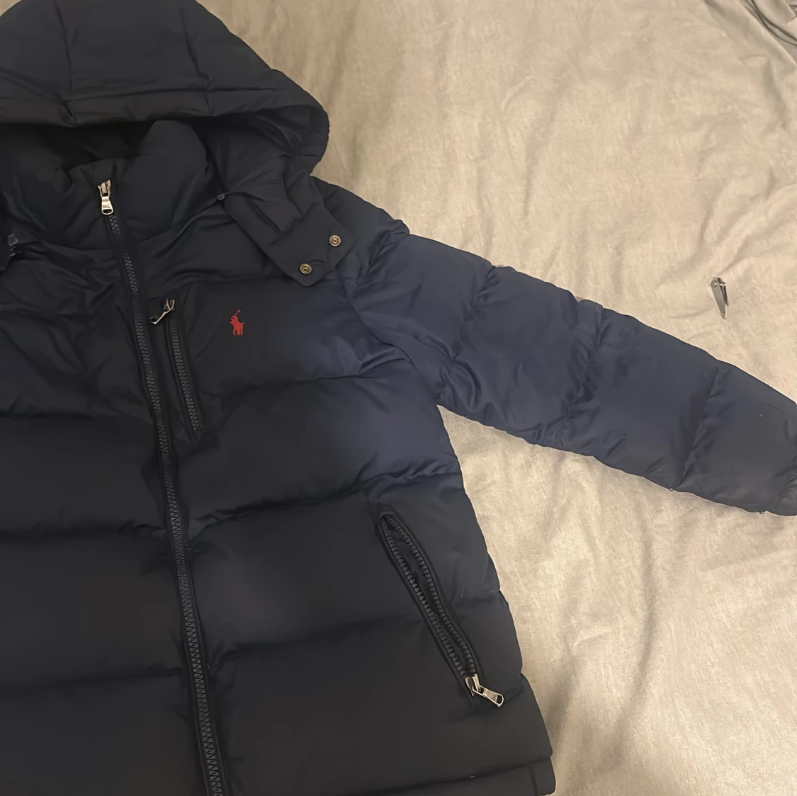 Snygg mörkblå dunjacka från Ralph Lauren med huva och dragkedjor på fickorna. Jackan har det klassiska röda Polo-loggan broderad på bröstet och är vadderad för extra värme. Perfekt för kalla dagar och har en stilren look. Ny pris 3200 mitt pris 1900kr säljer jag pågrund av att jag har väckt ur den jag köpte den förra vintern.