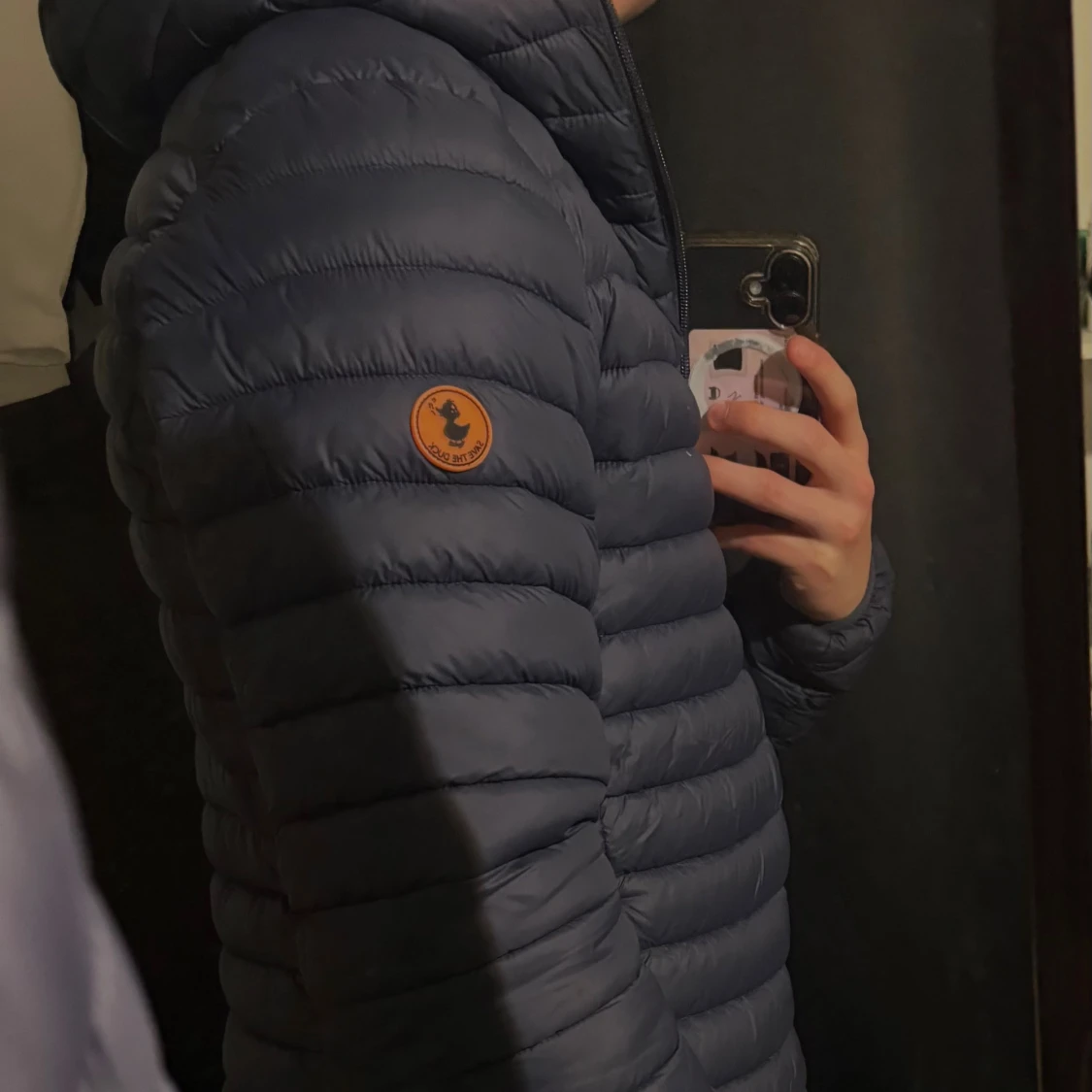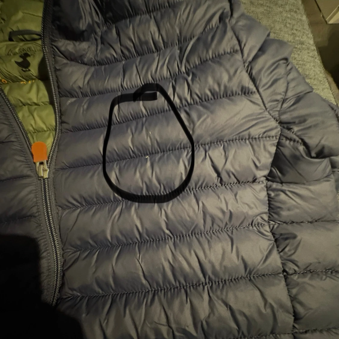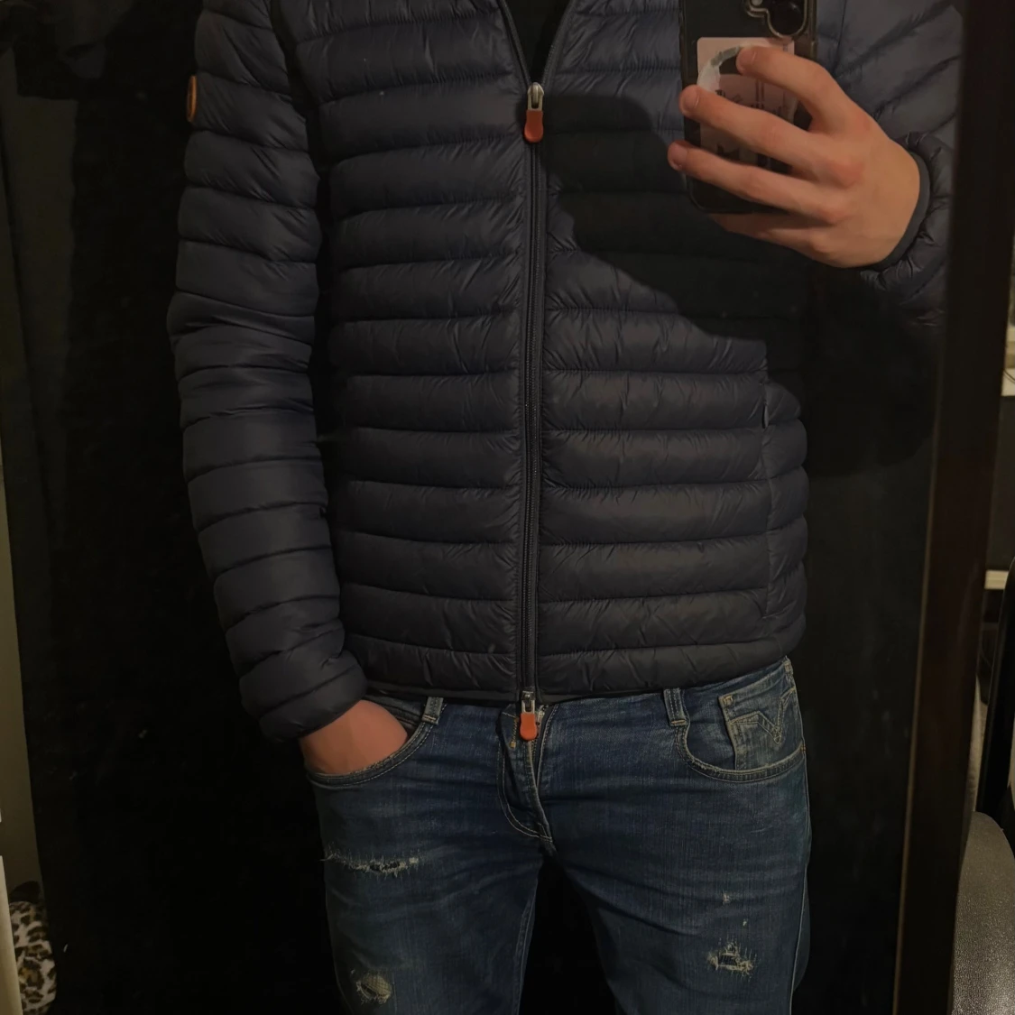 Säljer en snygg mörkblå dunjacka från save the duck och orange detaljer på dragkedjan. Jackan är quiltad och har en normal passform, perfekt för kyliga dagar. Insidan är olivgrön och jackan har långa ärmar samt tvåvägsdragkedja framtill.