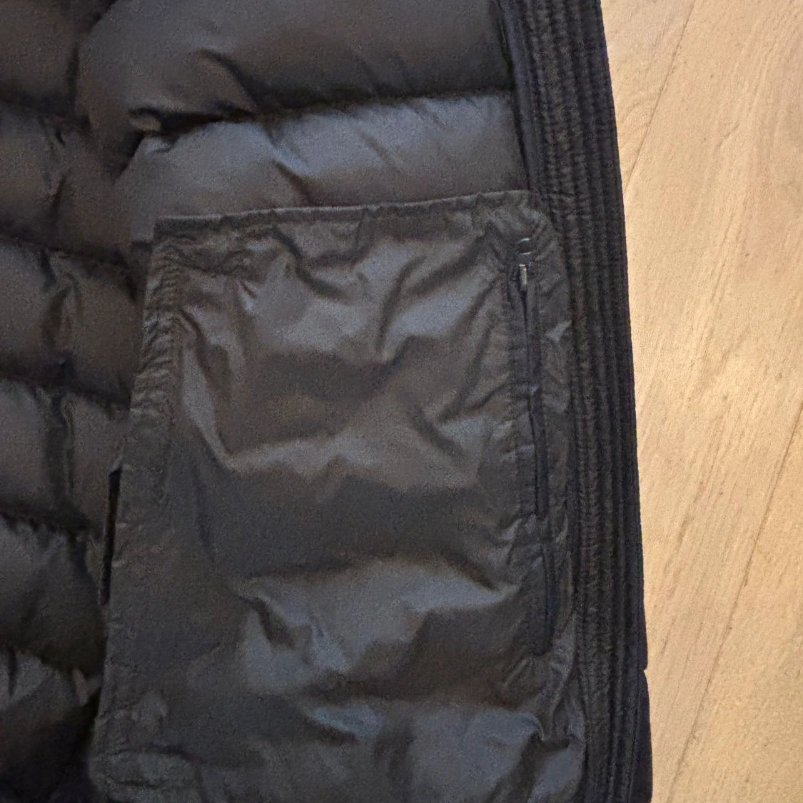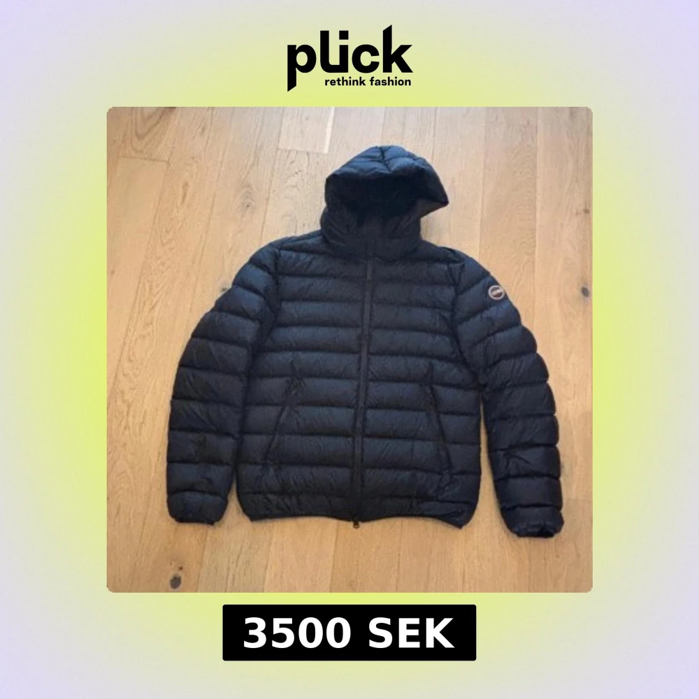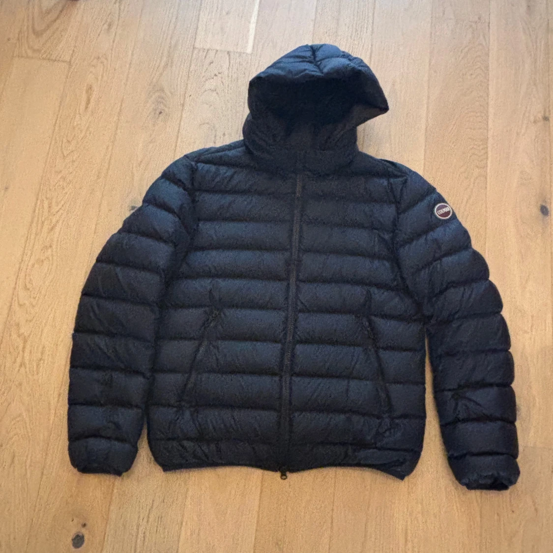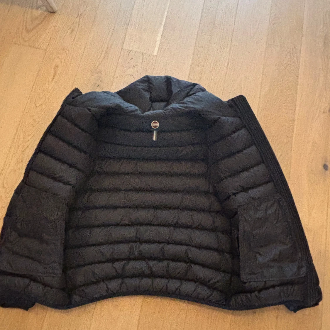 Säljer en svart dunjacka från Colmar med huva och horisontella sömmar. Jackan har dragkedja framtill, två sidofickor och en innerficka med dragkedja. Kvitto finns, Knappt använd och köptes inför förra säsongen.