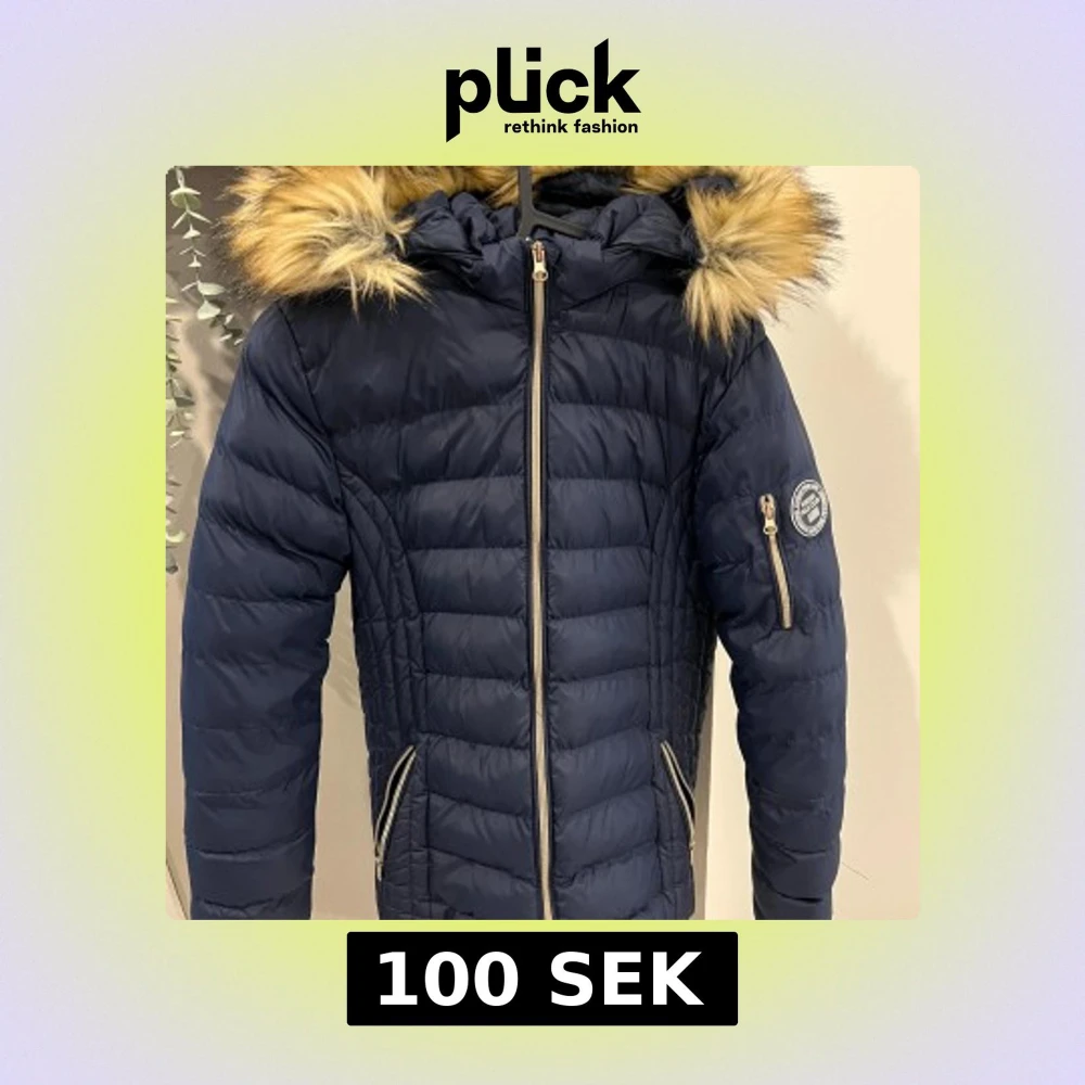 Snygg mörkblå dunjacka med fuskpäls på huvan och dragkedja framtill. Jackan har en quiltad design och en rund logotyp på ärmen. Perfekt för kyliga dagar. Barn storlek 14 🟰 med 36