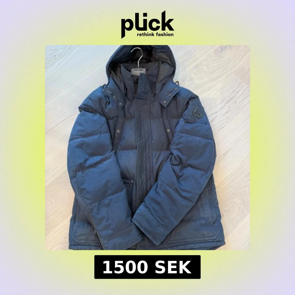 Snygg mörkblå dunjacka från Moose Knuckles med huva och ikonisk logga på ärmen. Jackan har flera fickor, dragkedja och knappar framtill. Perfekt för kalla dagar och riktigt street i stilen. Jackan är väll använd, har ägt den i några år nu