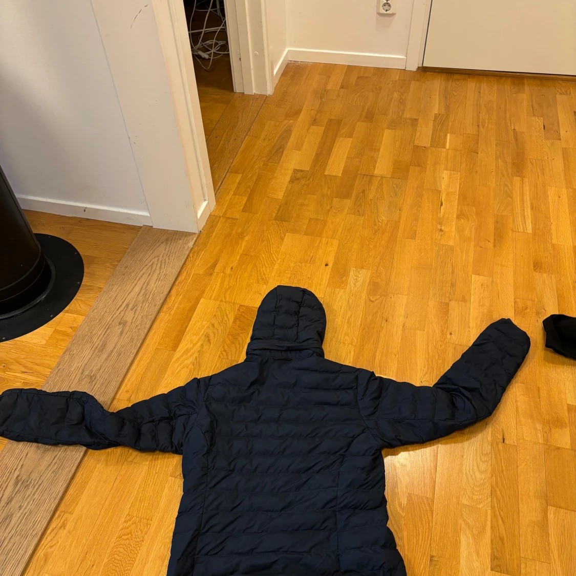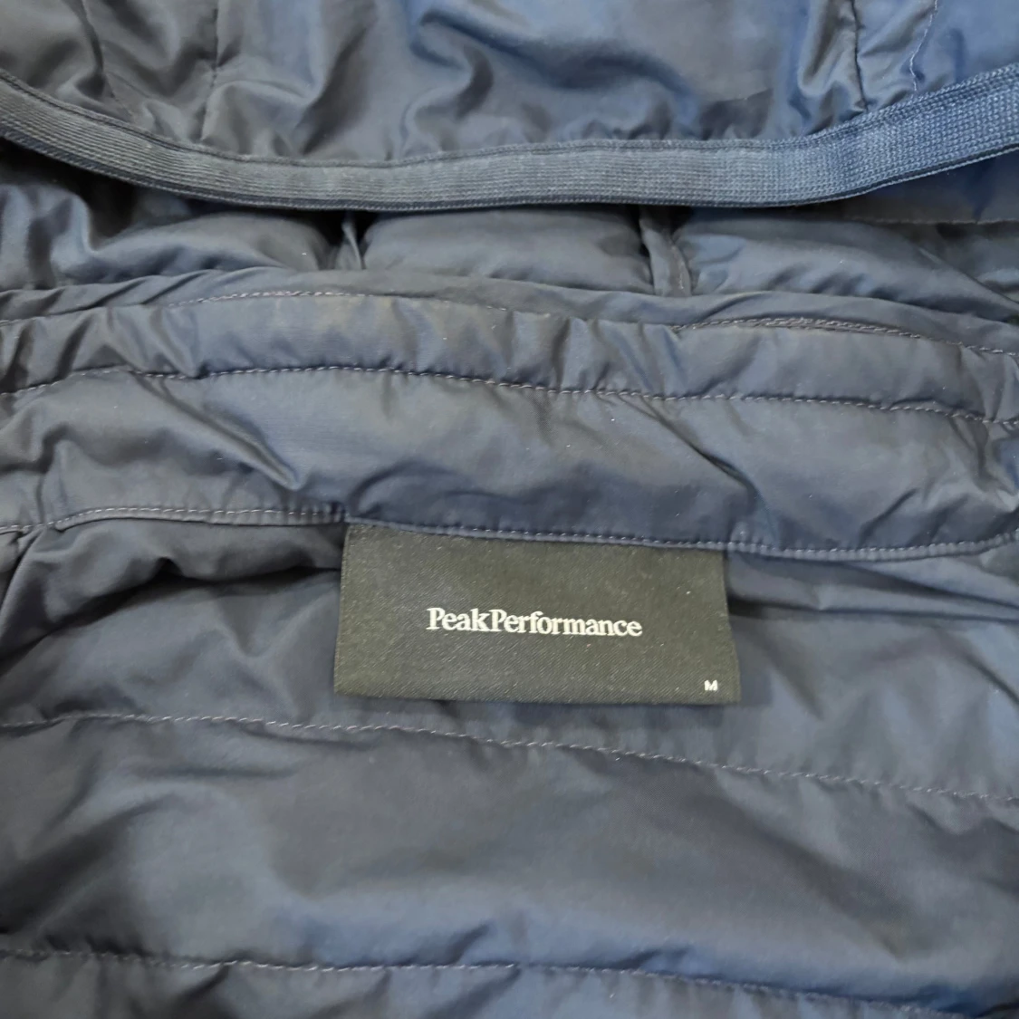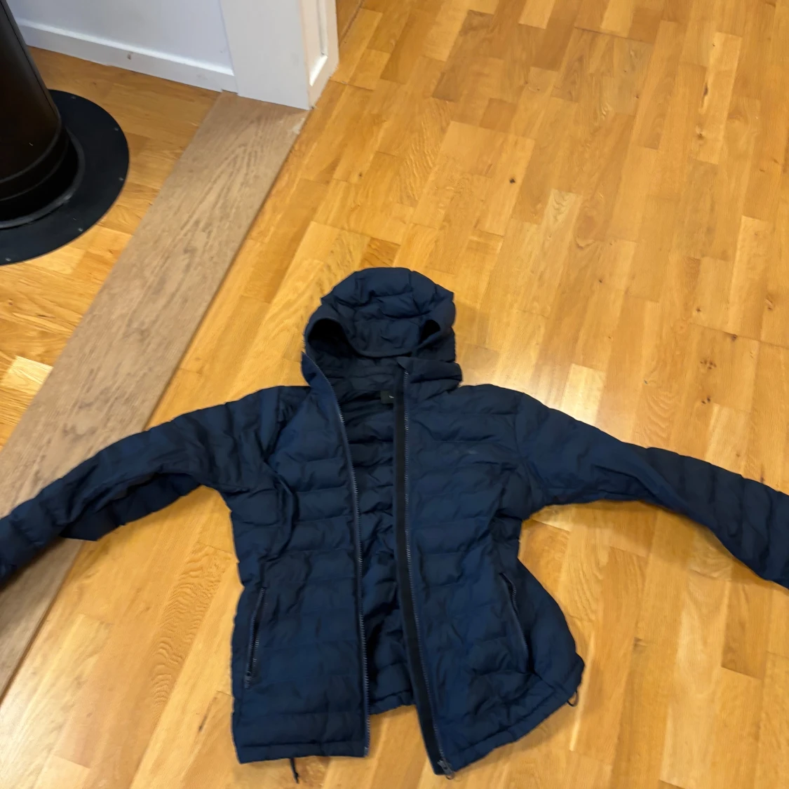 Snygg mörkblå dunjacka från Peak Performance i storlek M. Jackan har huva, dragkedja framtill och två sidofickor med dragkedja. Quiltad design och diskret logga på bröstet. Perfekt för kyliga dagar och har en sportig vibe.