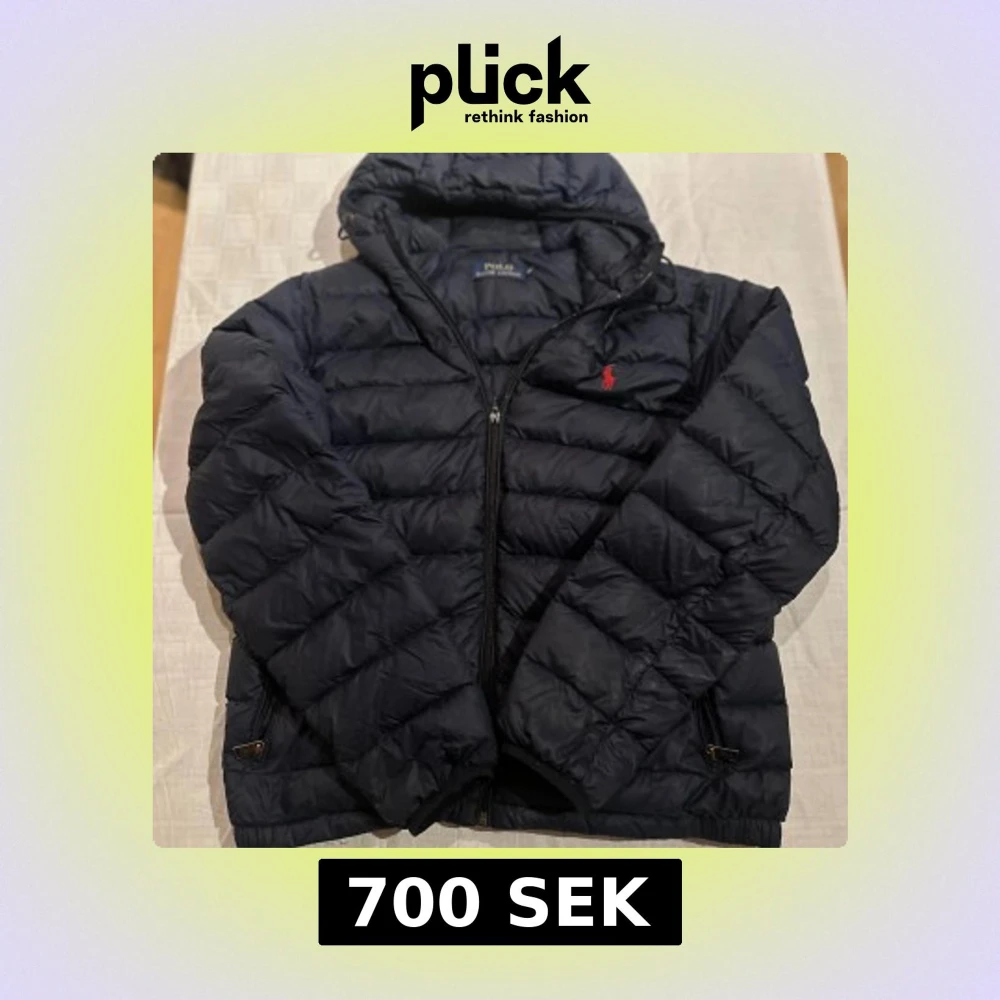 Snygg mörkblå dunjacka från Polo Ralph Lauren med huva och dragkedja. Jackan har det klassiska röda Polo-logot broderat på bröstet och två fickor med dragkedja. Quiltad design och normal passform, perfekt för kyliga dagar. OBS HAR ETT PYTTE LITET HÅL I ÄRMEN MEN DEN SYNS EJ MED BLÅTTA ÖGAT