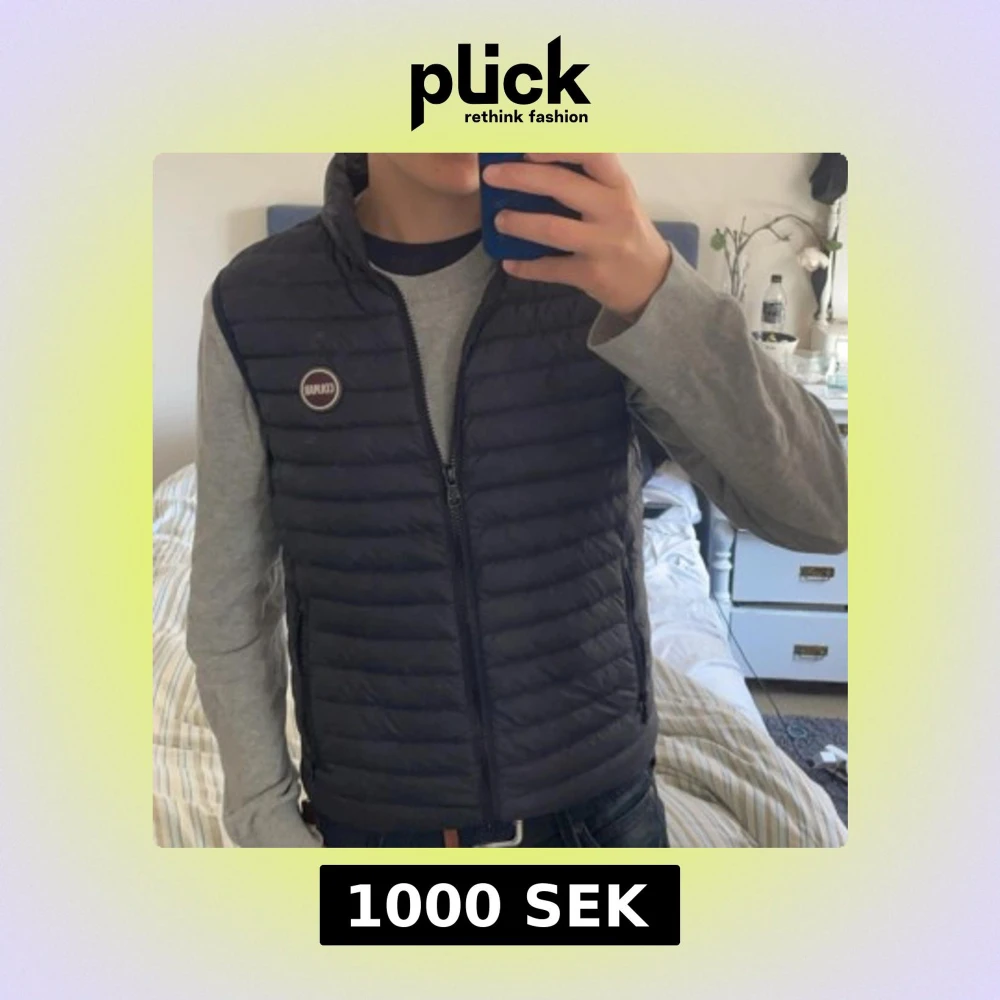 Säljer en mörkblå dunväst från Colmar med quiltad design och dragkedja framtill. Västen har en hög krage och en rund Colmar-logga på bröstet. Perfekt att slänga över en hoodie eller t-shirt för en chill look. Pris kan diskuteras